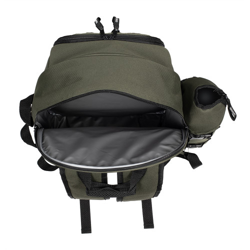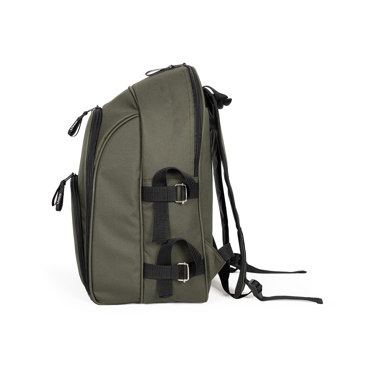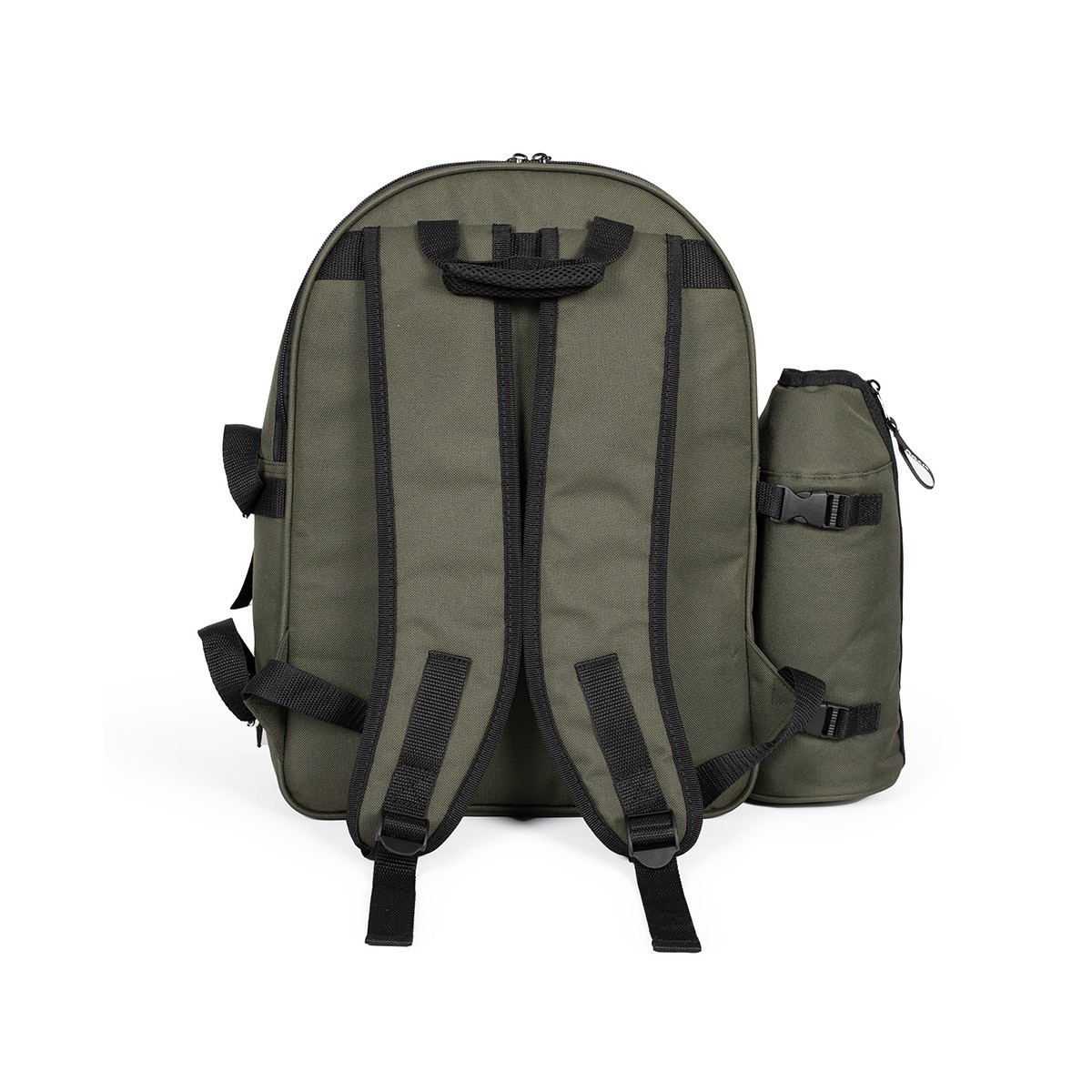 Pour 4 personnes. Compartiment isotherme d'une capacité de 11 L (42 x 28 x 8 cm), porte-bouteille isotherme détachable. En polyester 600D. Compartiment avec 30 accessoires : 4 couteaux, 4 fourchettes, 4 cuillères en acier inoxydable, 4 assiettes ø22,5 cm, 4 verres à vin 18 cl, 4 serviettes en non tissé, 1 salière, 1 poivrier, 1 boite pour le beurre, 1 ouvre-bouteille, 1 couteau à fromage et 1 planche à découper en bois. Accessoires compatibles lave-vaisselle (hormis serviettes et planche à découper). Poids : 1,8 kg