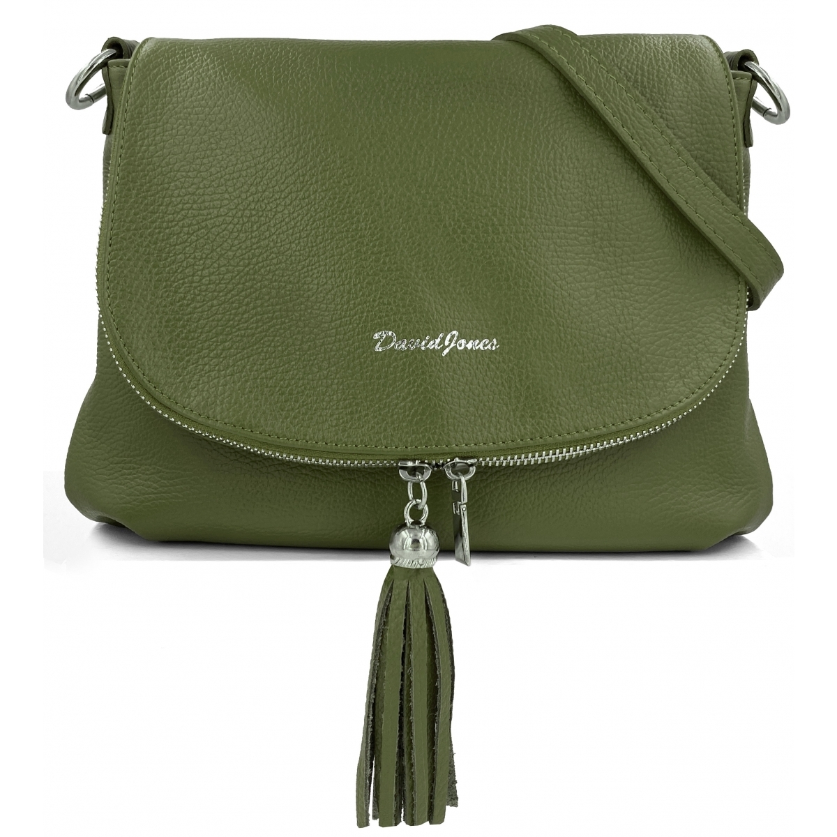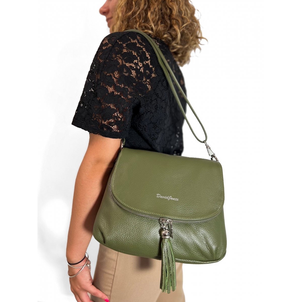 Détails extérieurs : 1 rabat clippé à l'avant, 1 fermeture zippée sur le rabat avant, Détail pompons sur les curseurs de fermeture du rabat 1 bandoulière amovible et ajustable, 1 poche arrière zippée, Cuir de vachette, Siglé DAVID JONES Remarque : Les boucles et autres accessoires sont de coloris doré.
