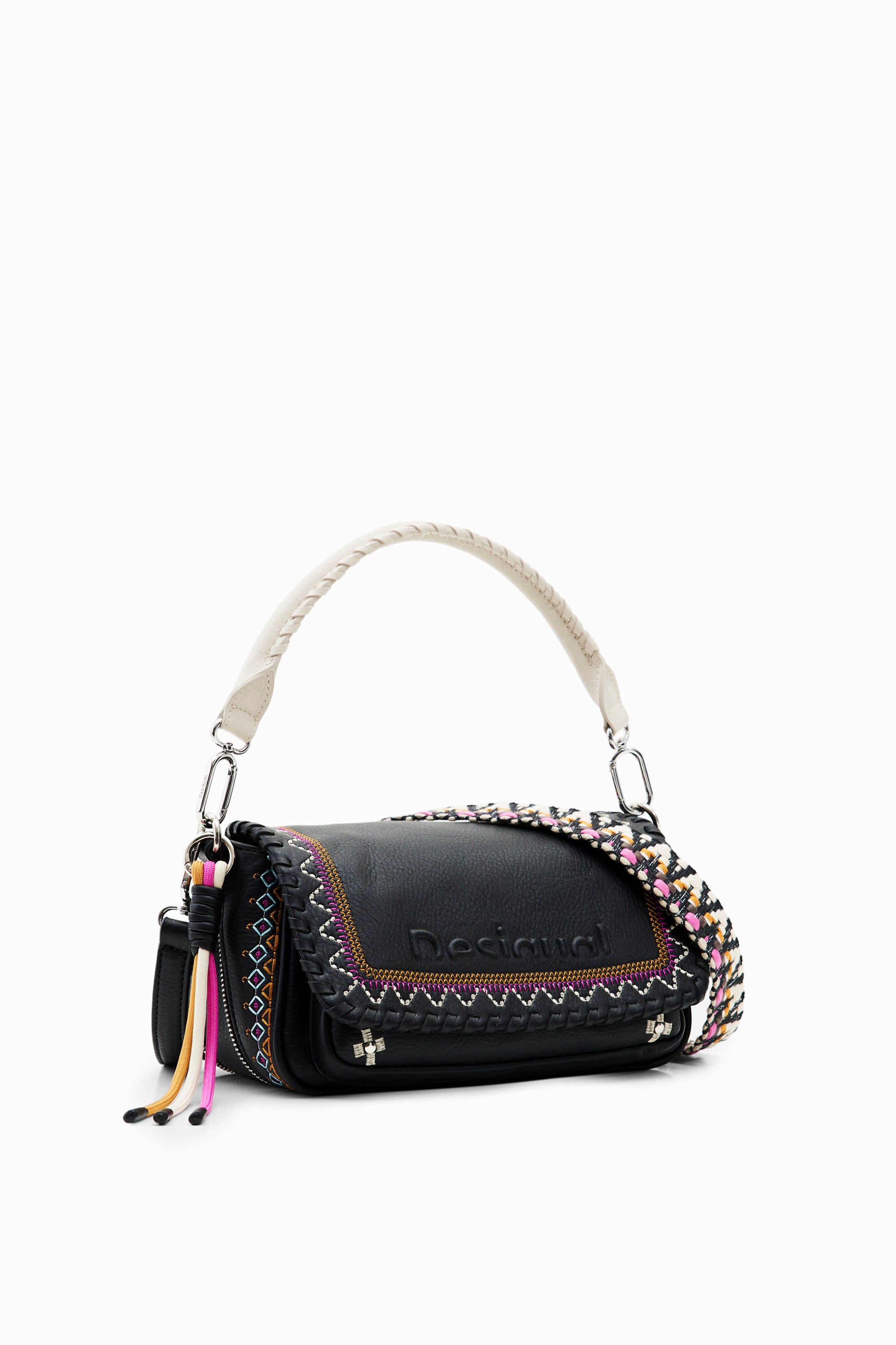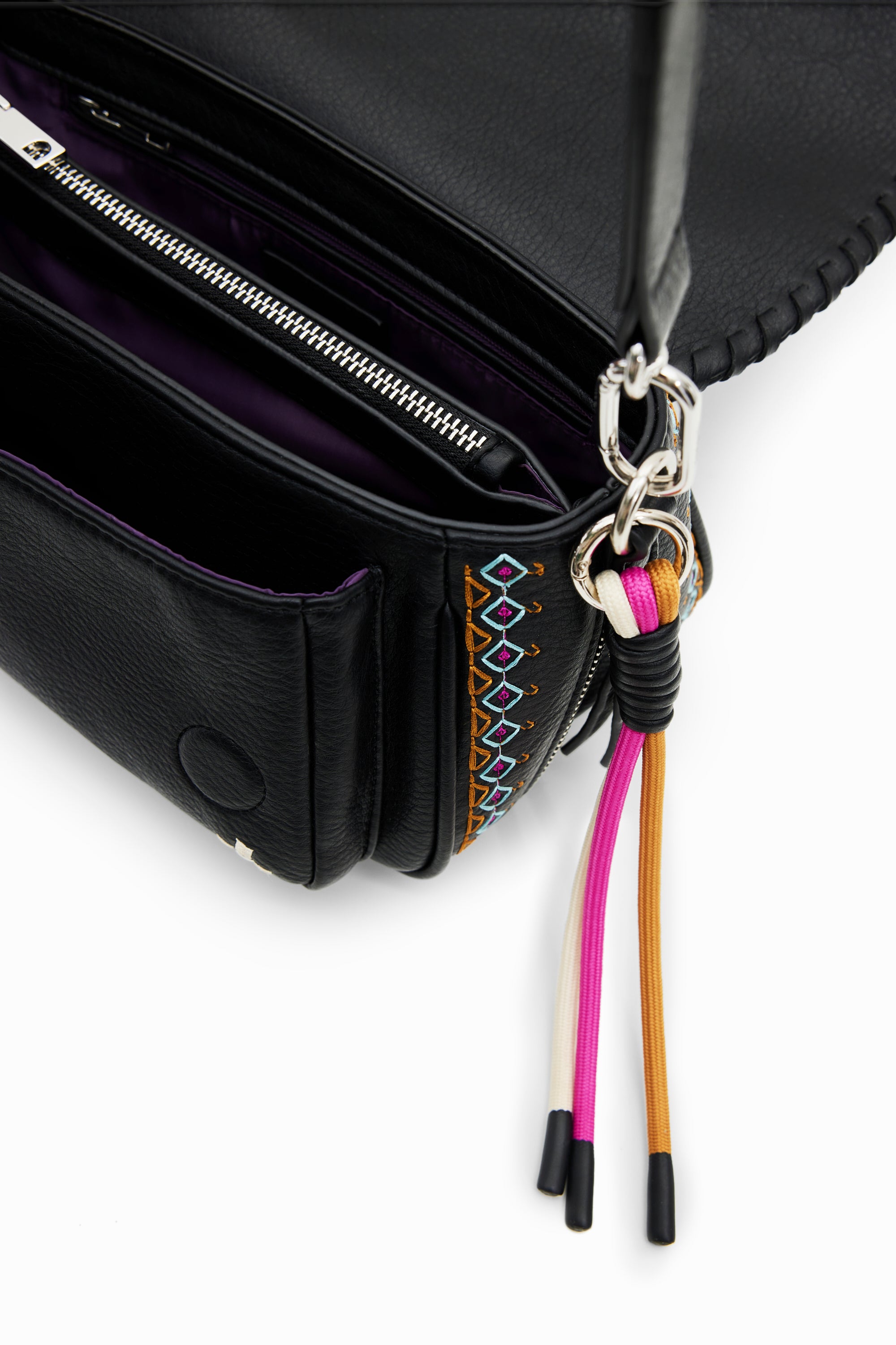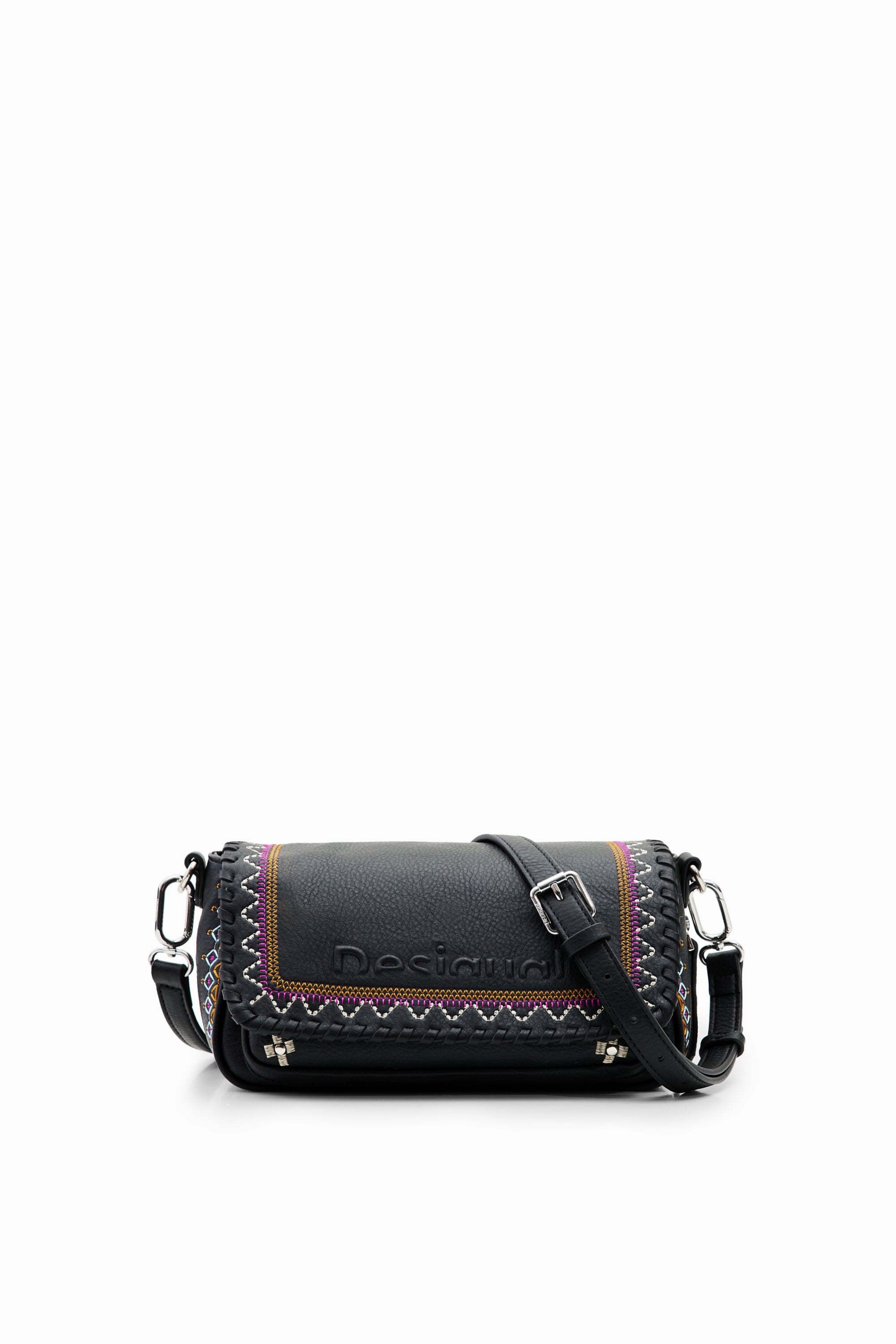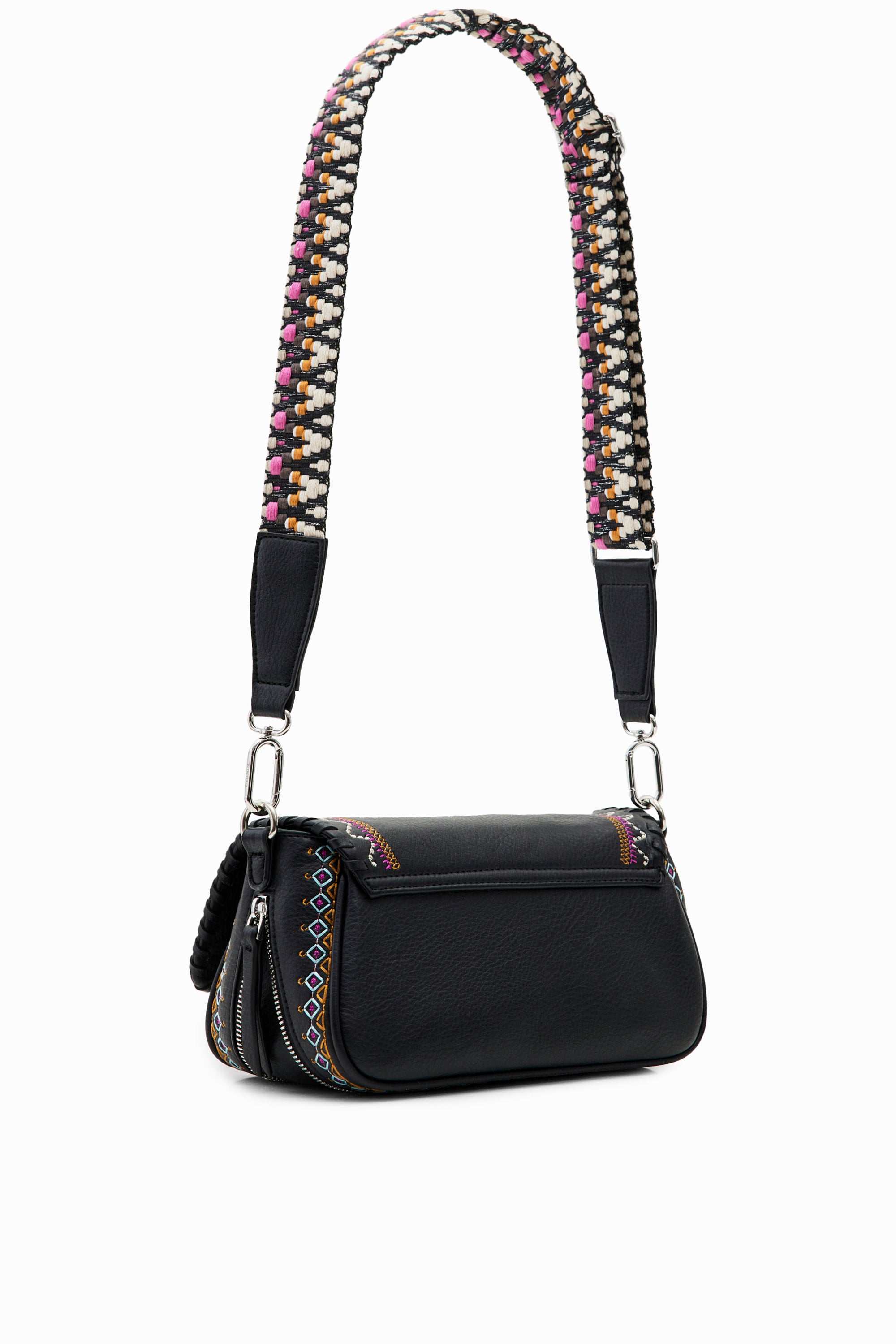 Sac à bandoulière de taille moyenne effet cuir, avec des broderies contrastantes et plusieurs anses et poches.