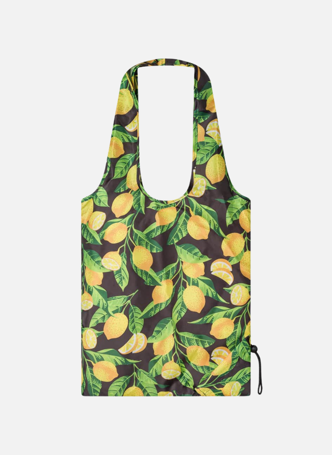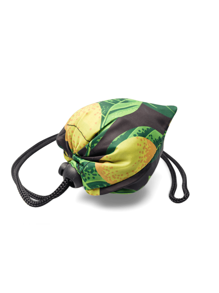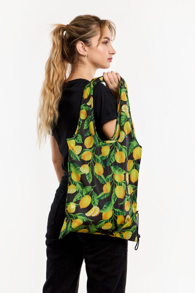 Sac de courses fantaisie en matière recyclée, motifs Citrons jaunes. Encombrement minimal avec sa proche pratique pour le ranger quand il est vide. Vous pouvez l'assortir avec vos chaussettes.