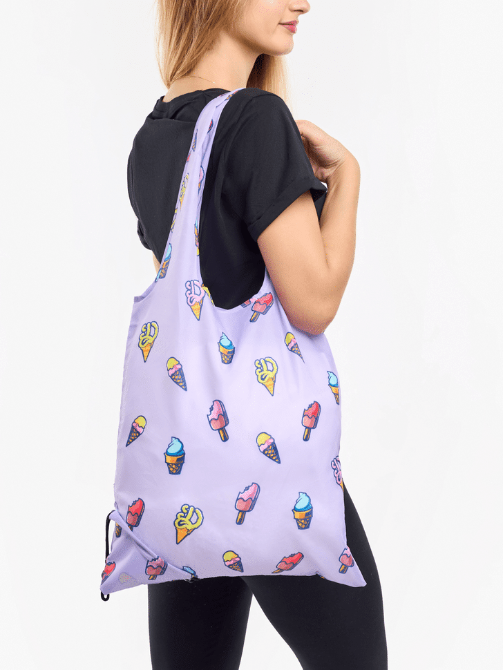 Sac de courses fantaisie en matière recyclée, motifs Cornets de Glace. Encombrement minimal avec sa proche pratique pour le ranger quand il est vide. Vous pouvez l'assortir avec vos chaussettes.