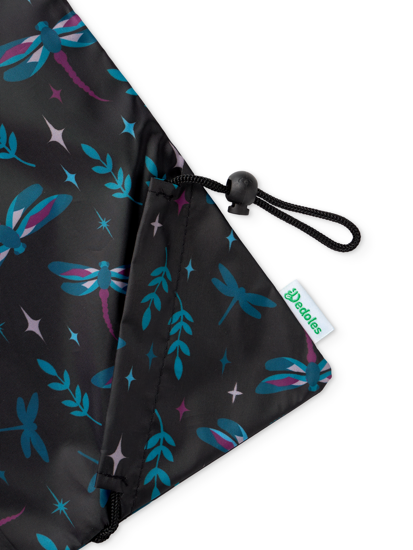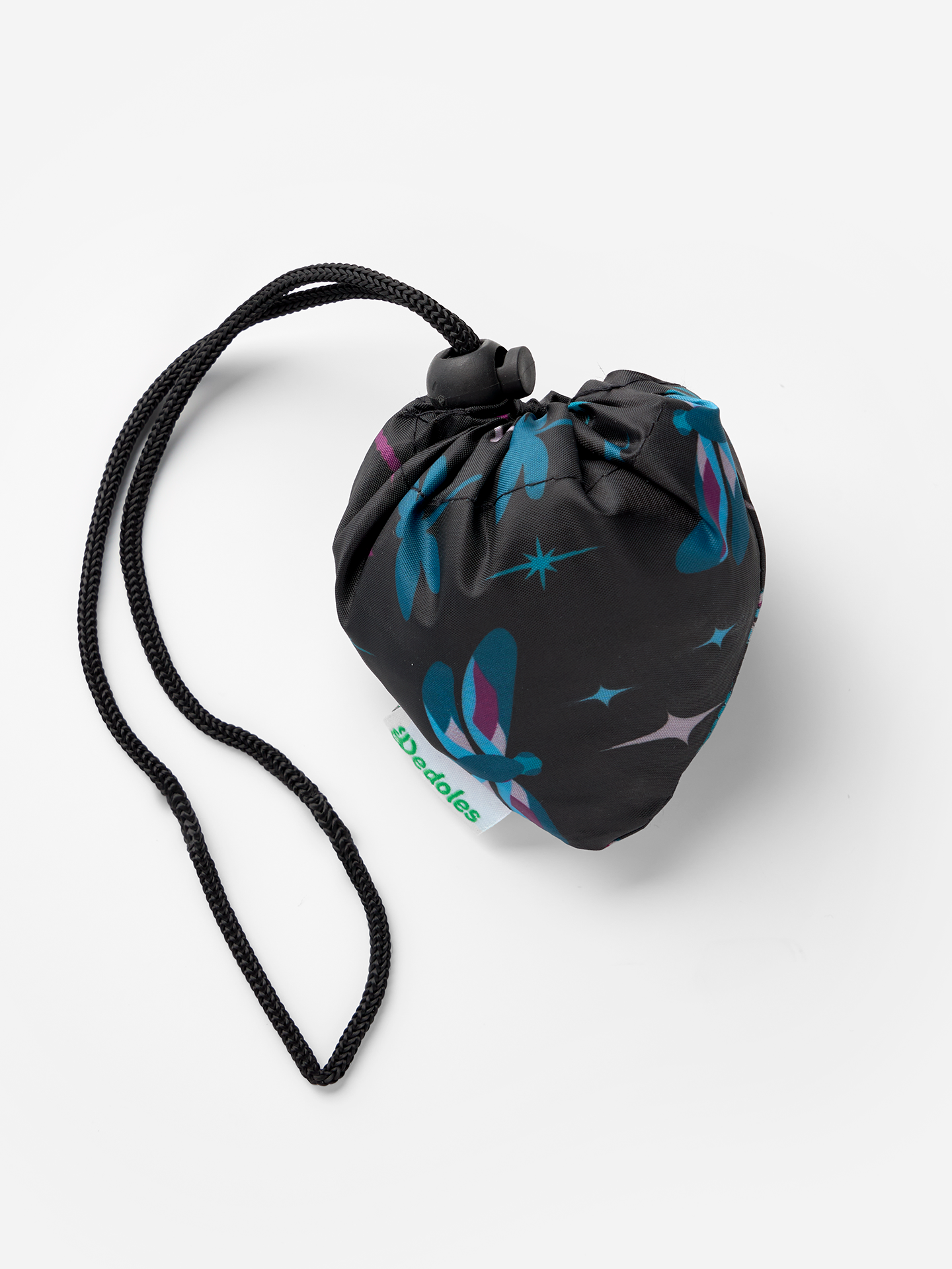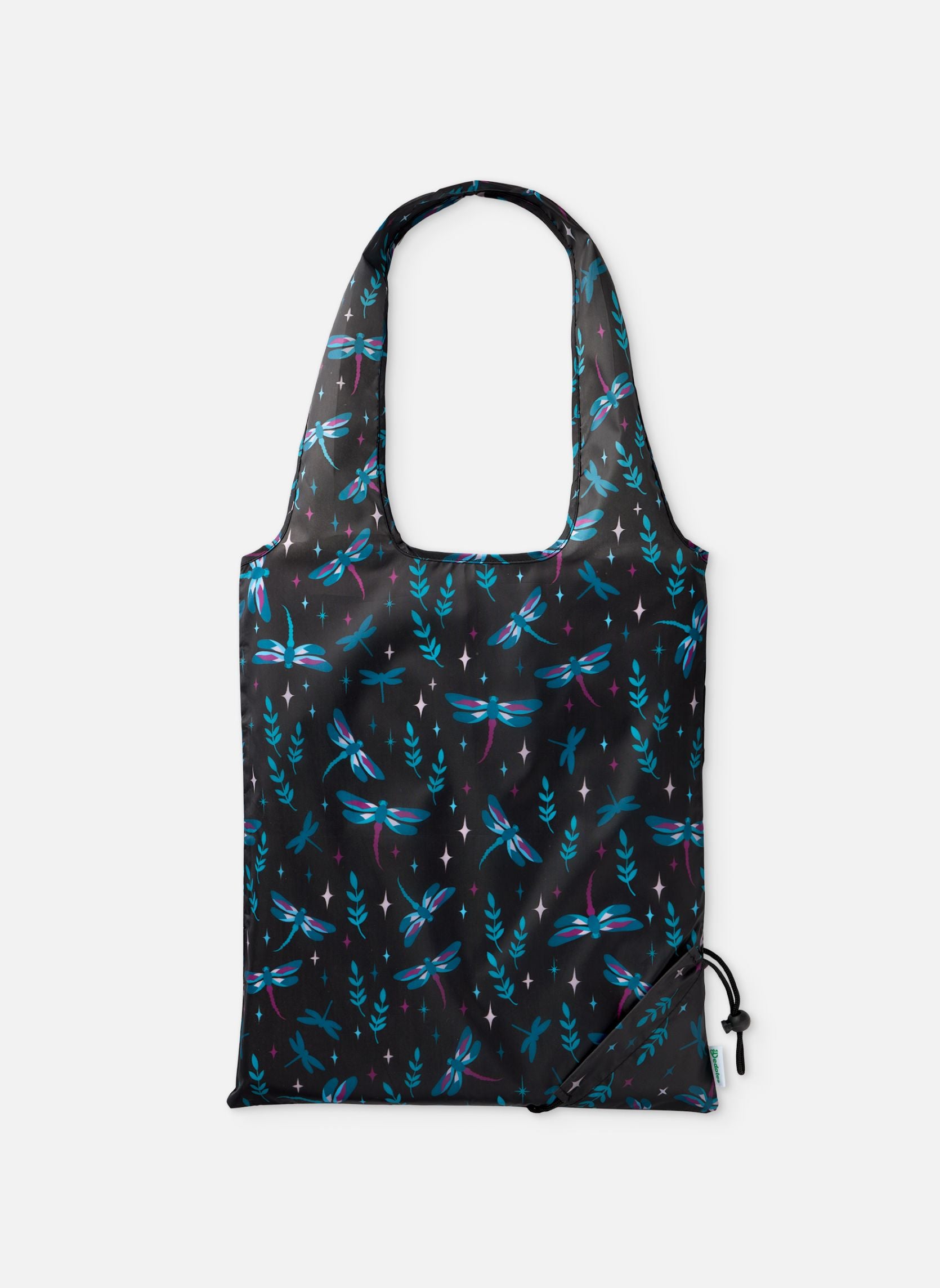 Sac de courses fantaisie en matière recyclée, motifs Libellules dans la Nuit. Encombrement minimal avec sa proche pratique pour le ranger quand il est vide. Vous pouvez l'assortir avec vos chaussettes.