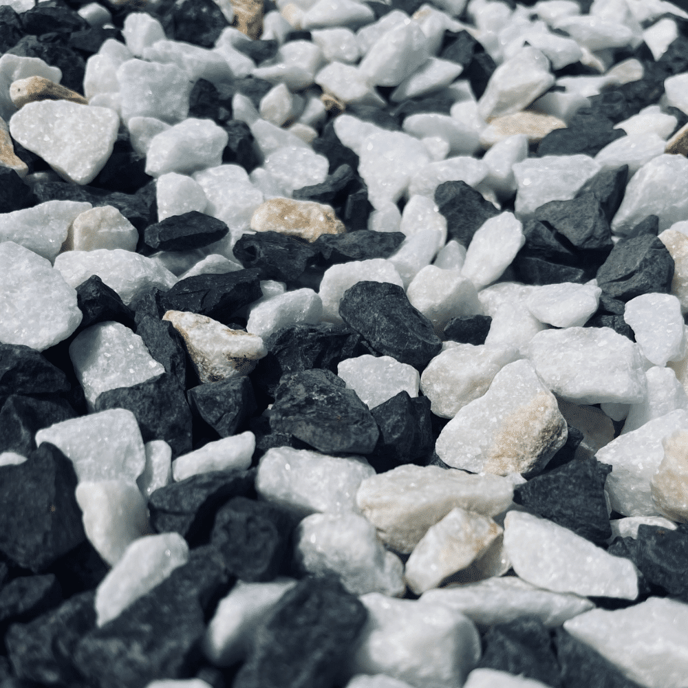 King Matériaux vous présente son tout nouveau gravier unique : le gravier panda blanc et noir. C'est un mélange de marbre blanc concassé brillant et de noir basalte au fini mat. Il donnera donc un cachet immédiat à votre allée carrossable, décorative ou encore à vos jardinières et zones décoratives extérieures.