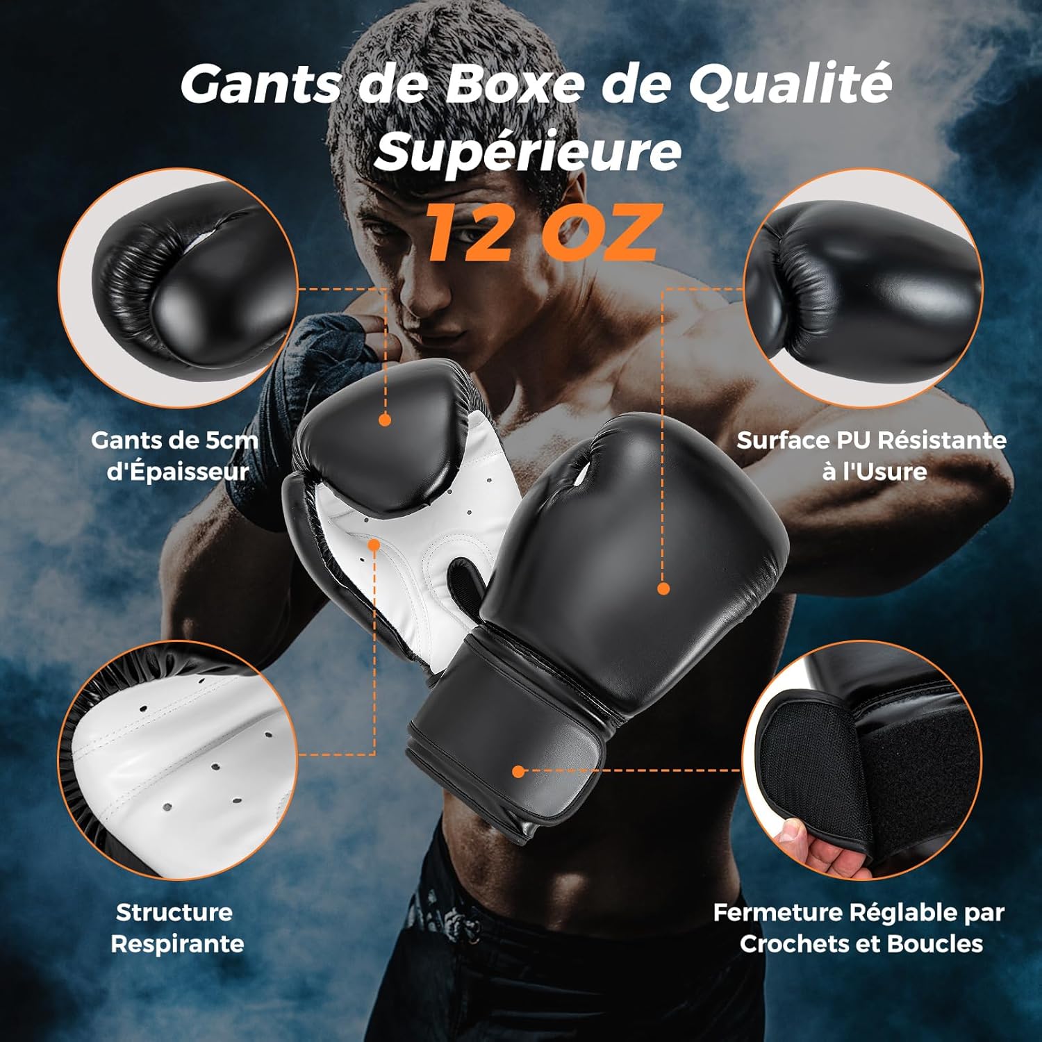 [ Gants de boxe haut de gamme de 12oz ] Dotés d'une surface en PU résistante à l'usure et d'un rembourrage de 5 cm d'épaisseur, ces gants offrent une protection et un confort supérieurs pour vos doigts, poignets et articulations. Par ailleurs, la sangle facile à crochet et boucle vous permet d'enfiler et de retirer les gants facilement.