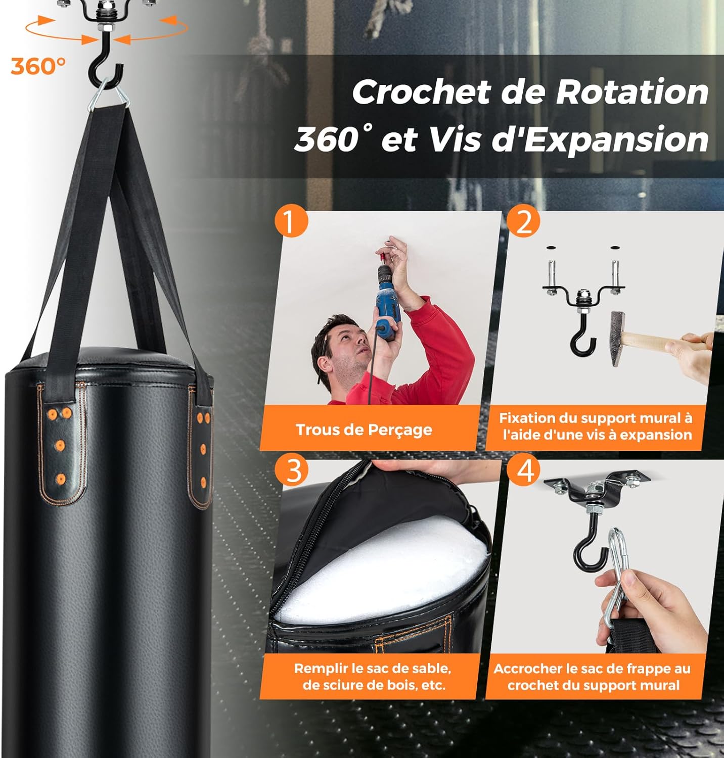[ Facile à suspendre ] Notre sac de frappe est doté d'un design pivotant à 360°, vous permettant de vous déplacer et de frapper sous tous les angles. De plus, le sac de frappe est équipé de 2 sangles en toile, d'un crochet robuste avec des boucles et de vis d'expansion pour une installation facile et sécurisée.