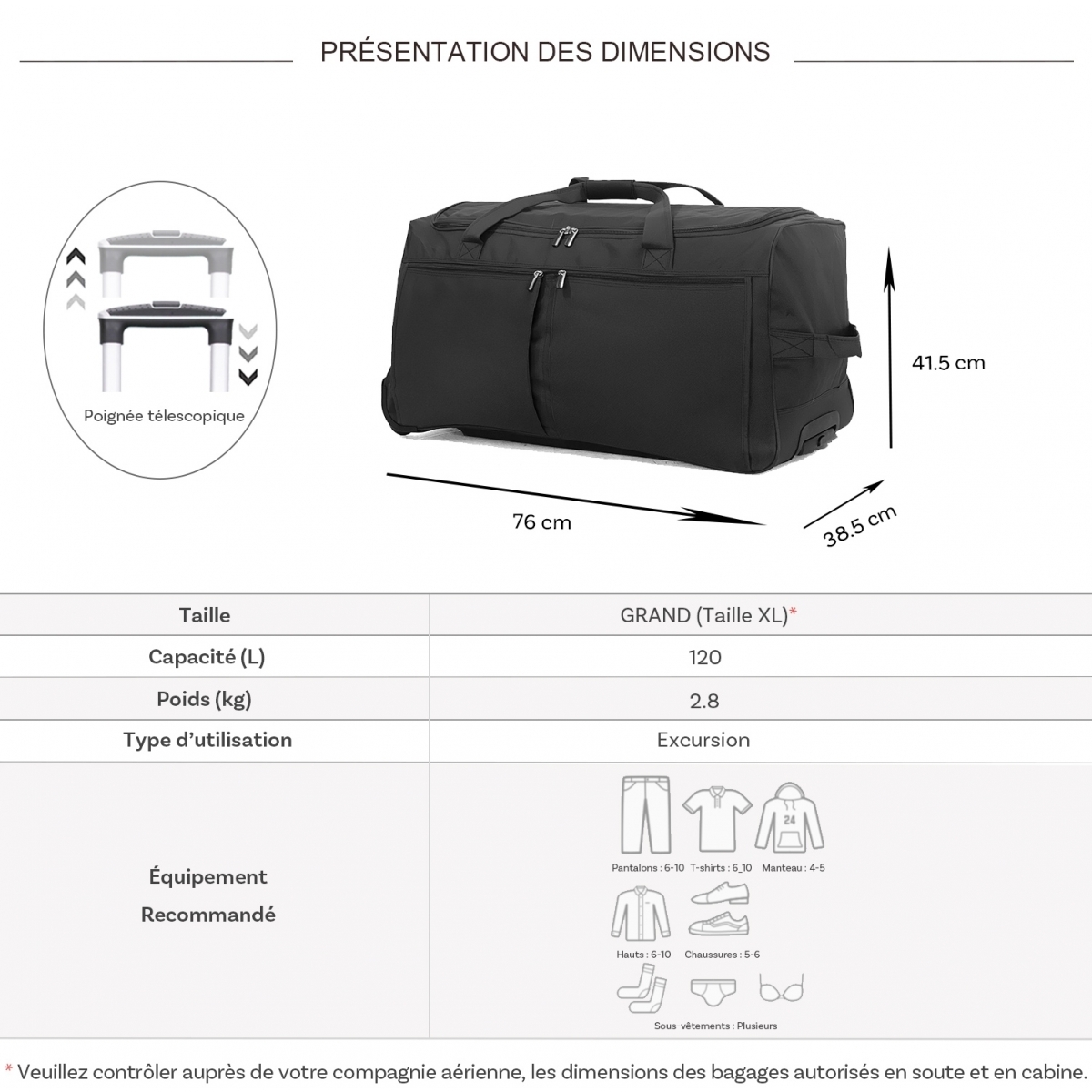 | Libellé | Sac de voyage avec roulettes 120L grand volume 76cm |