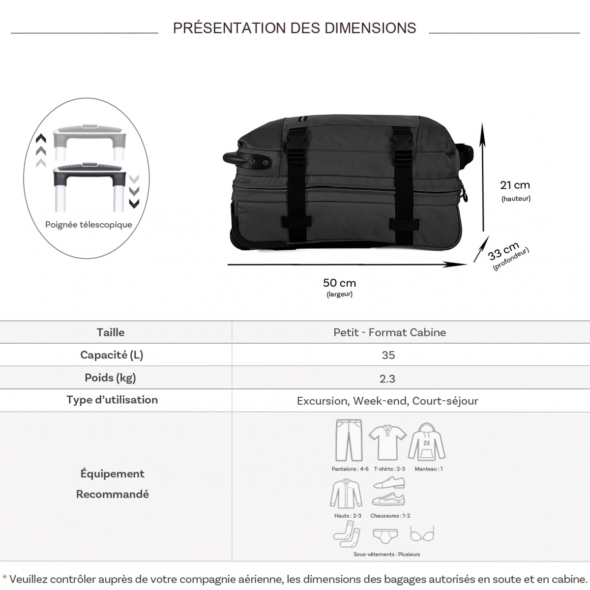 | Libellé | Sac de voyage cabine à roulettes 35L double compartiment 50cm |