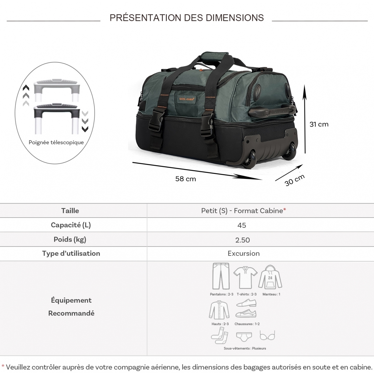 | Libellé | Sac de voyage cabine à roulettes 45L double compartiment 58cm |