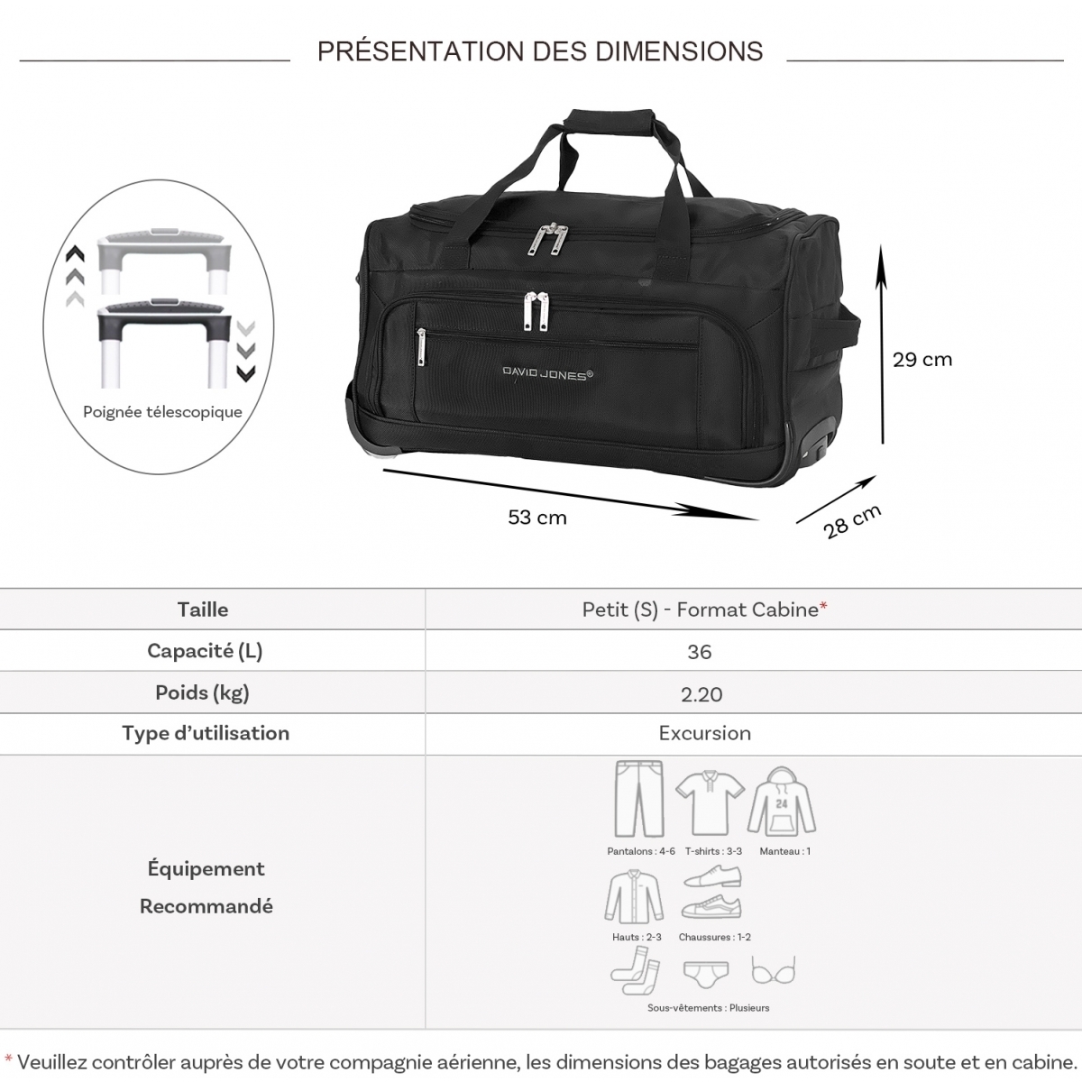| Libellé | Sac de voyage cabine avec roulettes 36L 53cm |