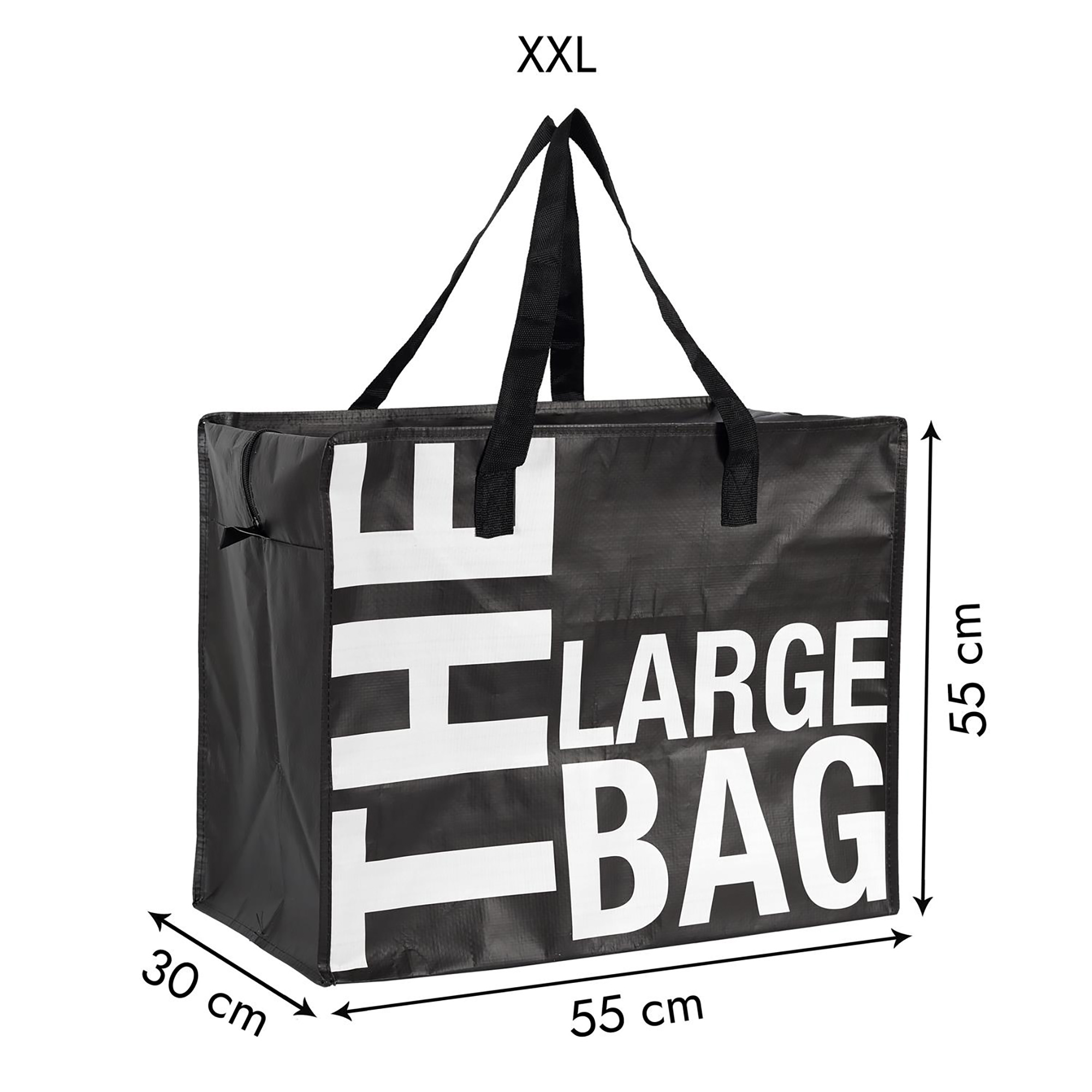 | Plus produit | Sac multi usage XXL PILI noir "The Large bag" 90L en plastique PP (polypropylène); Dimensions 55cm de largeur, hauteur 55cm, longueur 30cm et fermeture zip |