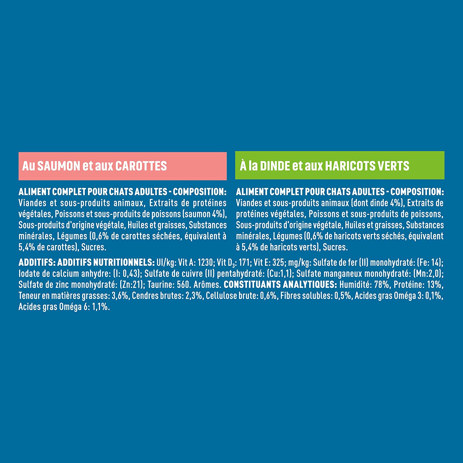 Au saumon et aux carottes : Viandes et sous-produits animaux, extraits de protéines végétales, légumes (5% à partir de carottes déshydratées), poissons et sous-produits de poissons (dont saumon 4%), sous-produits d?origine végétale, substances minérales, huiles et graisses, sucres.