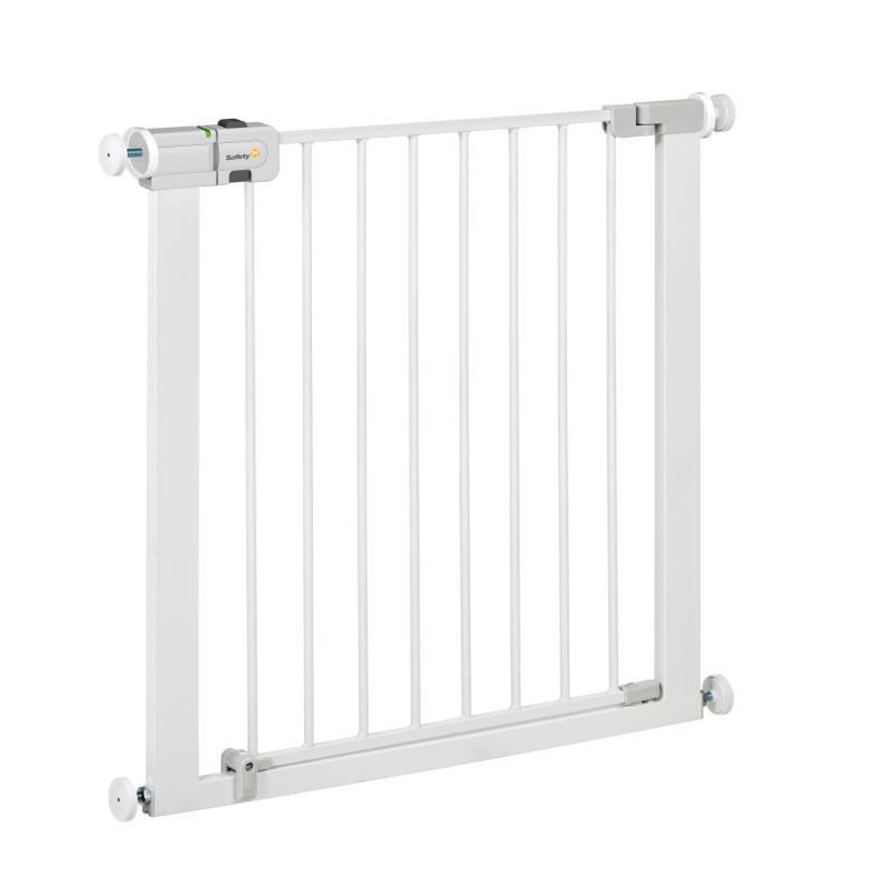 Barriere a pression, avec portillon. Systeme de fixation : par pression 4 points (pas de trou dans les murs). Technologie SecurTech® : indique la bonne fermeture de la barriere (voyant vert/rouge). Largeur sans extension : 73 - 80 cm. Jusqu'a 136 cm avec extensions (vendues séparément). Ouverture d'une main. Fermeture facile : systeme claquer pour fermer. Choix du sens d'ouverture. Matiere : métal blanc