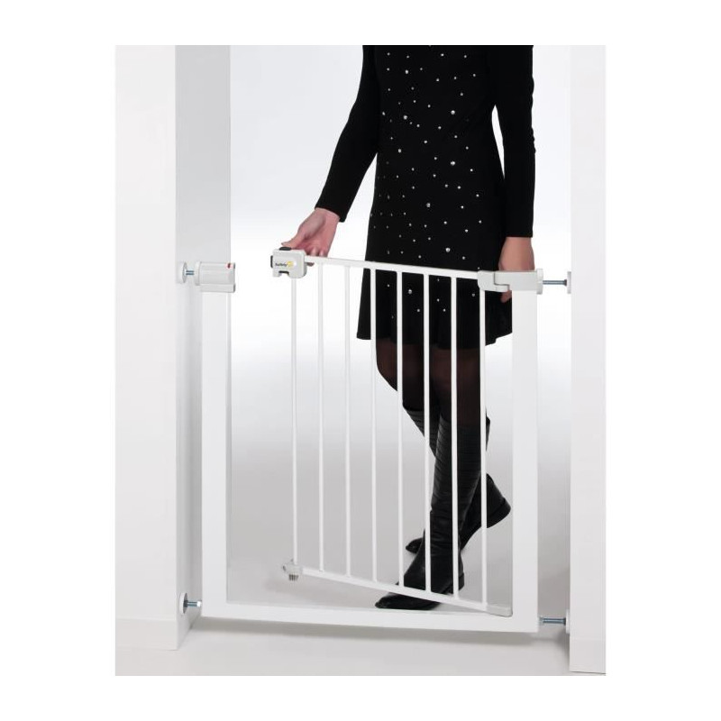Barriere a pression, avec portillon. Systeme de fixation : par pression 4 points (pas de trou dans les murs). Technologie SecurTech® : indique la bonne fermeture de la barriere (voyant vert/rouge). Largeur sans extension : 73 - 80 cm. Jusqu'a 136 cm avec extensions (vendues séparément). Ouverture d'une main. Fermeture facile : systeme claquer pour fermer. Choix du sens d'ouverture. Matiere : métal blanc