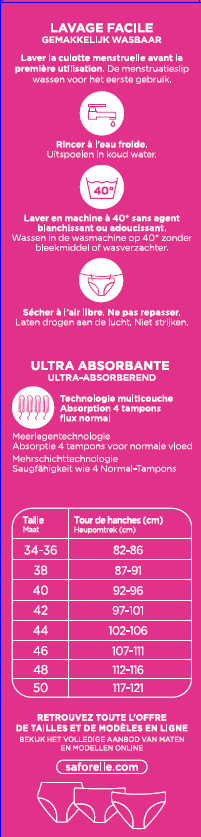 Pendant les périodes de menstruations - pour une utilisation quotidienne. Pour un flux normal (la technologie multi-couches a été conçue pour absorber l'équivalent de 4 tampons). Laver la culotte menstruelle avant la première utilisation, en machine à 40° sans agent blanchissant ou adoucissant. Sécher à l'air libre. Puis après usage, passer d'abord sous l'eau avant de la mettre dans la machine à laver. Ne pas repasser. Ne pas jeter dans les toilettes