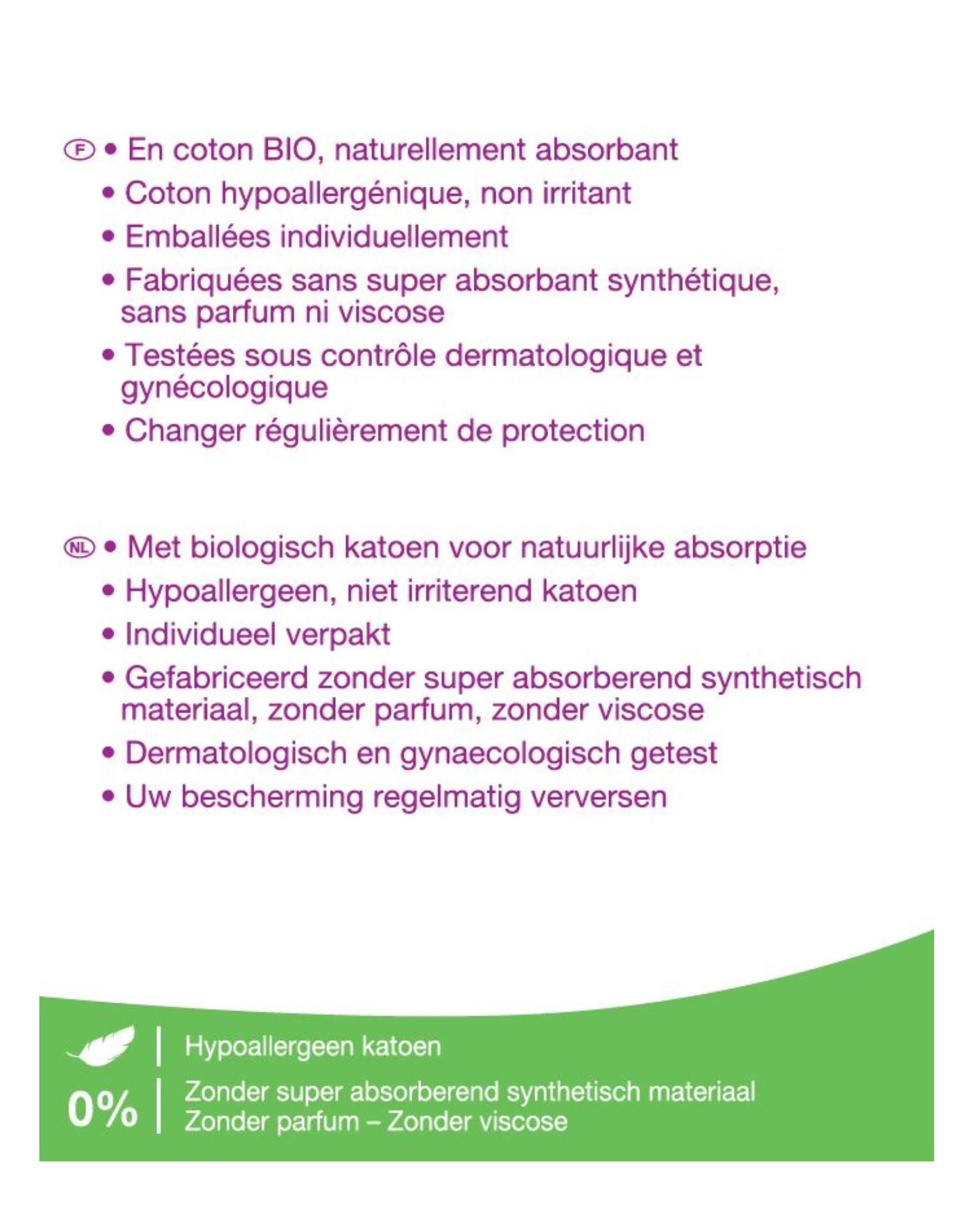 Ingrédients : Fabriqués en coton biologique certifié GOTS par ICEA Cœur absorbant : 100 % coton biologique Feuille perforée (non tissée) : 100% coton biologique Adhésif :Synthétique Enveloppement individuel : Film Bio polymer Couche imperméable : film Bio-polymer Protecteur d'adhésif : Papier silicone Ruban adhésif : Ruban en polypropylène - adhésif en résine et caoutchouc synthétique