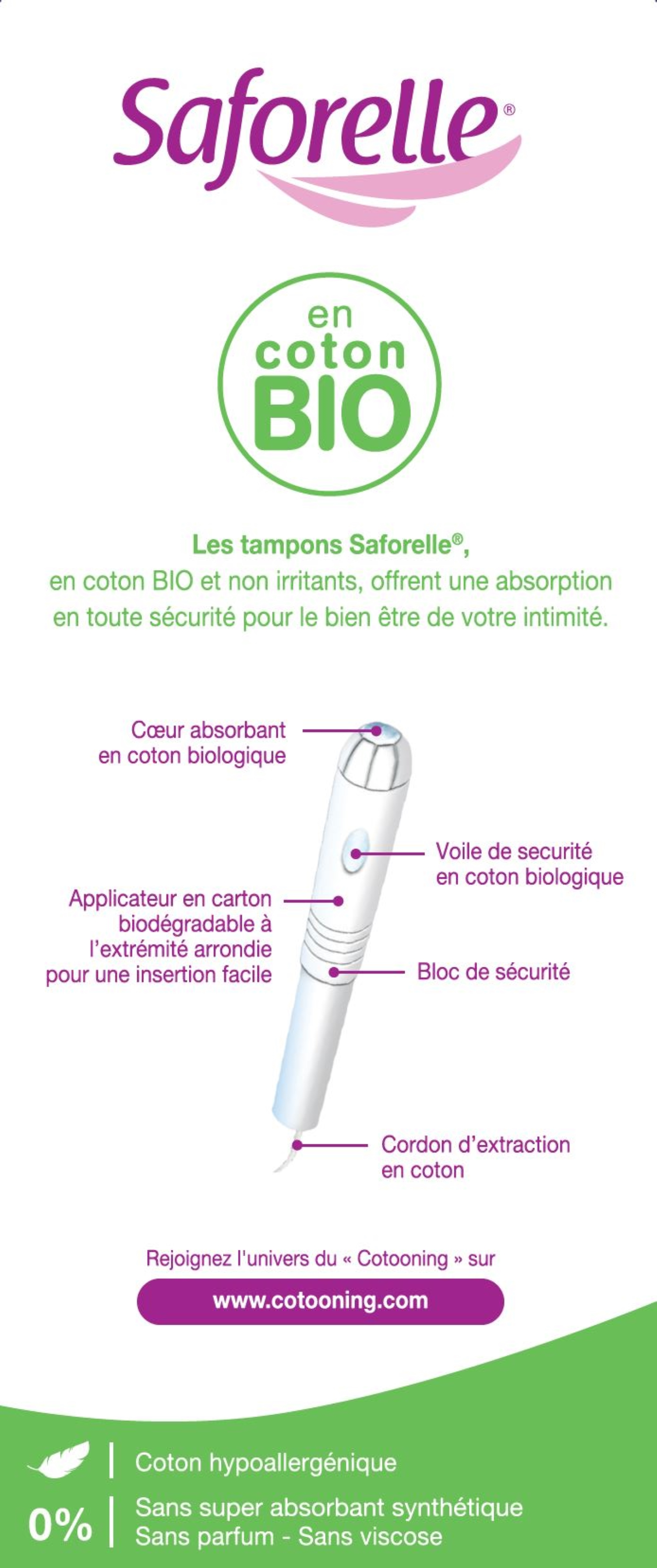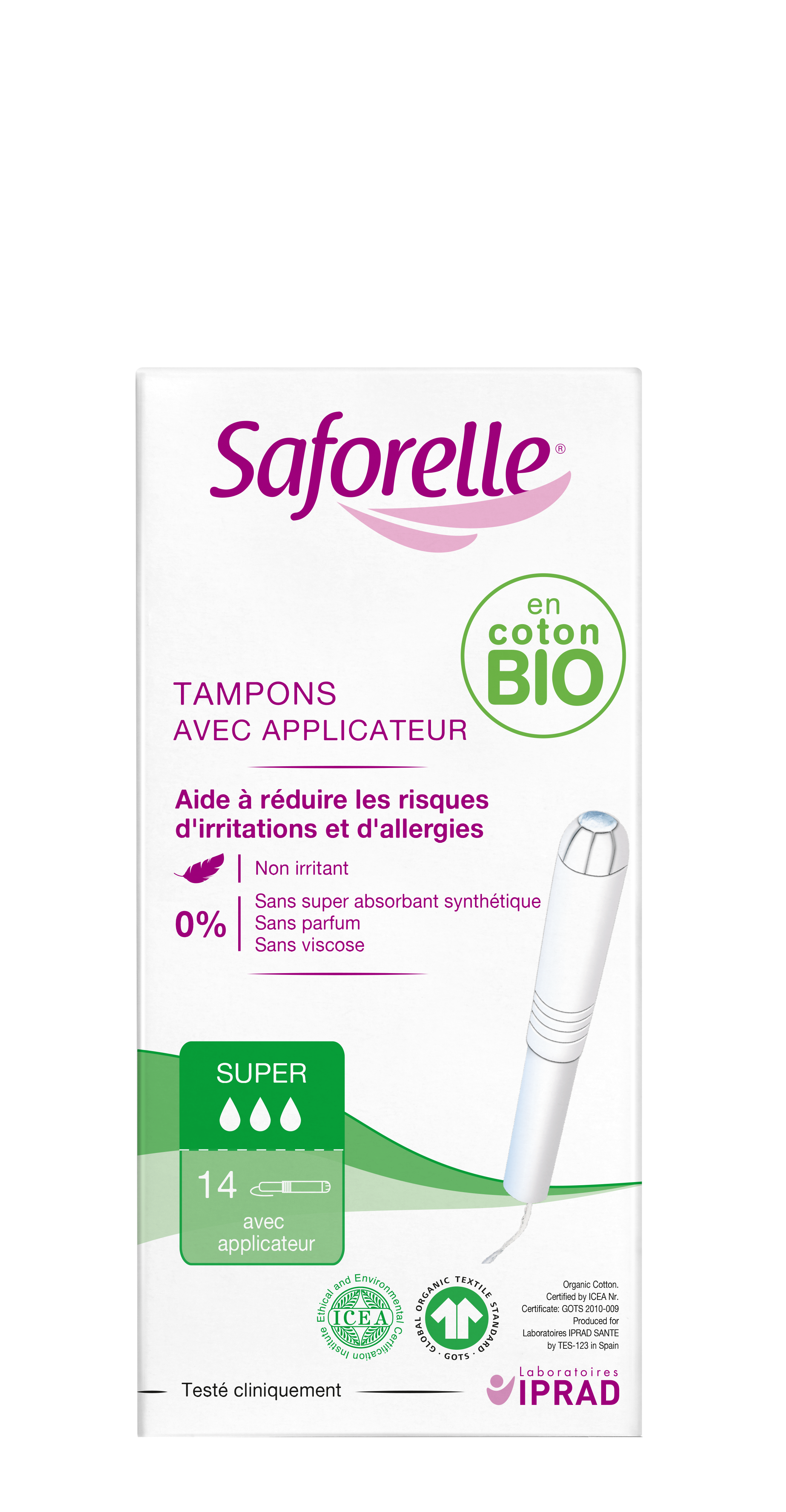 [Cet avis a été recueilli en réponse à une offre.] J’utilise depuis quelques temps maintenant les tampons bio avec applicateur de chez saforelle. Ils aident à réduire les risques d’irritation et d’allergies. Le système d’applicateur permet une application tres rapide et efficace. Ils sont ultra absorbant. Ils restent en place. Aucune gêne ressenti après l’avoir mis en place. Aucune irritation. Je les recommande vivement.