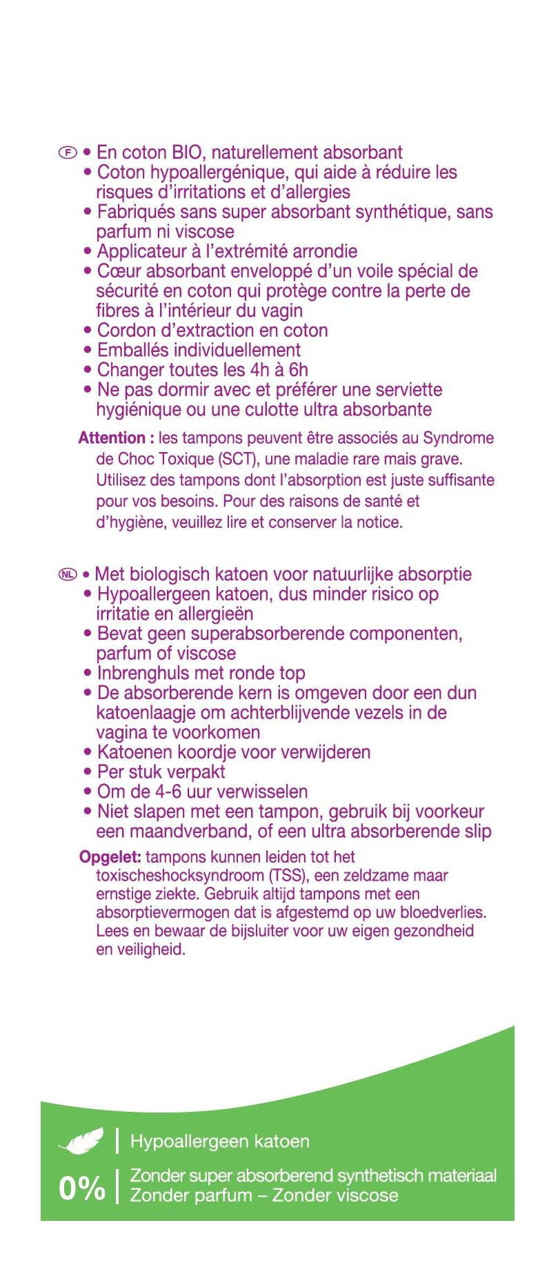 Ingrédients : Fabriqués en coton biologique certifié GOTS par ICEA Cœur absorbant : 100 % coton biologique Applicateur extérieur : Carton Applicateur intérieur : Carton Emballage : papier en cellulose Voile de sécurité : 100% coton biologique Cordon de retrait : 100% coton Fils de couture : 30% coton et 70% polyester