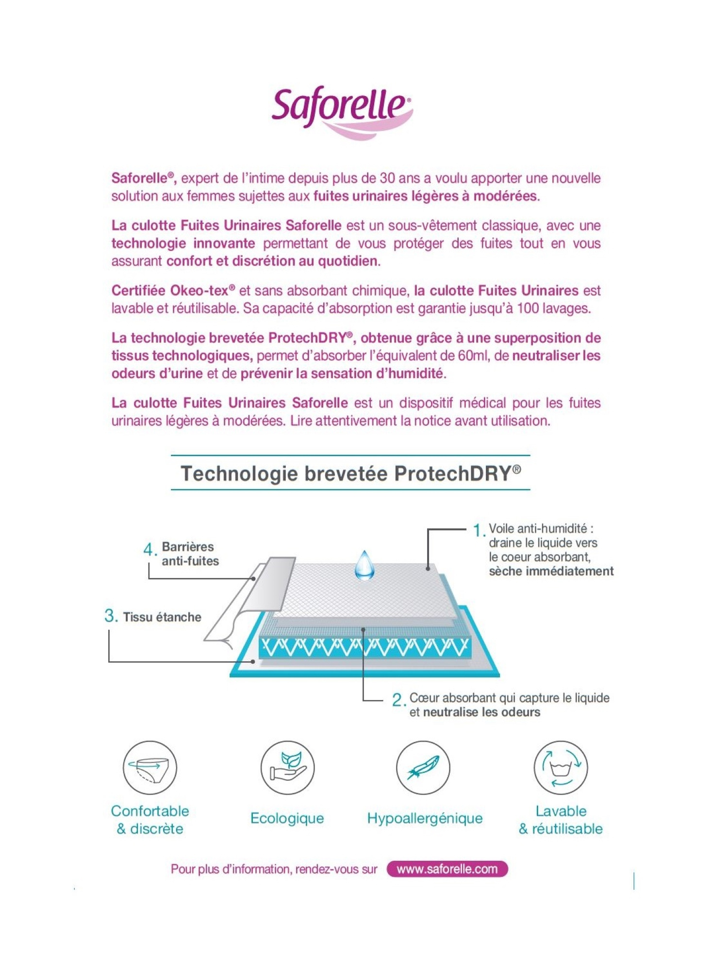 Saforelle Culotte Fuites Urinaires est un dispositif médical qui a été conçu pour les femmes sujettes aux fuites urinaires légères à modérées. La culotte Fuites urinaires Saforelle est un sous-vêtement classique, avec une technologie innovante permettant de vous protéger des fuites tout en vous assurant confort et discrétion au quotidien. La technologie brevetée ProtechDRY®, obtenue grâce à une superposition de tissus technologiques, permet d’absorber l’équivalent de 60ml, de neutraliser les odeurs et de prévenir la sensation d’humidité. Certifiée Okeo-tex® et sans absorbant chimique, la Culotte Fuites Urinaires est lavable et réutilisable. Sa capacité d’absorption est garantie jusqu’à 100 lavages.