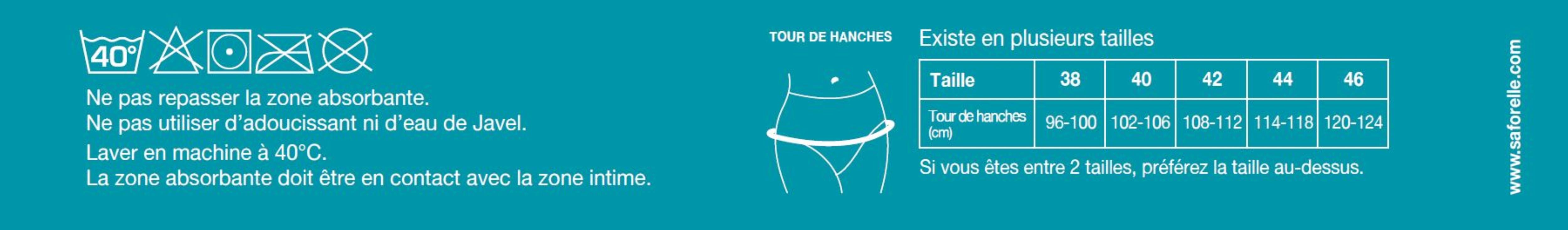 Avant la 1ère utilisation, lavez la culotte Lavable à 40° - Séchage au sèche-linge possible - Pour les femmes sujettes aux fuites urinaires légères à modérées. La culotte Fuites urinaires Saforelle est un sous-vêtement classique, avec une technologie innovante permettant de vous protéger des fuites tout en vous assurant confort et discrétion au quotidien. Si vous êtes entre 2 tailles, préférez la taille au-dessus. Le choix de la bonne taille est important pour une efficacité optimale La structure absorbante doit être en contact avec la région génitale. Textile lavable