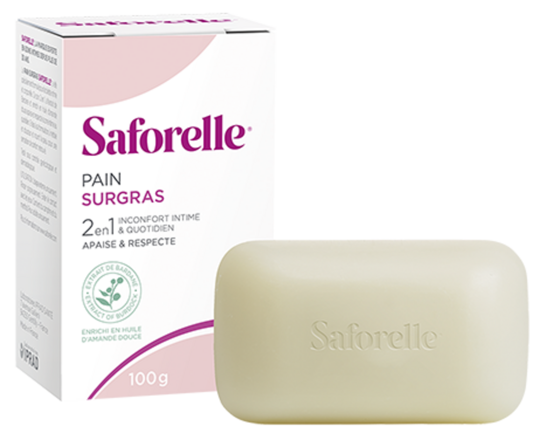 Le savon ou pain Surgras de Saforelle permet de nettoyer en douceur la zone intime sans la dessécher, tout en calmant les irritations. Il est en effet important d’utiliser des produits adaptés non agressifs pour les muqueuses afin de préserver sa flore vaginale. Ce savon s’utilise également pour le corps. Vous n’avez ainsi pas besoin de plusieurs produits pour votre toilette corporelle et intime. Il sera par ailleurs votre compagnon de voyage idéal en n’encombrant pas votre trousse de toilette ou votre vanity. Formulé avec des extraits de bardane, plante d’Asie et d’Europe reconnue depuis l’Antiquité pour ses propriétés apaisantes et calmantes, le savon surgras vous apporte un confort et une sensation de bien-être optimal. Le pain surgras au pH alcalin est également enrichi en huile d’amande douce pour un nettoyage et une application tout en douceur et une réelle sensation d’apaisement. Les racines de Bardane sont aujourd’hui cultivées en France et soigneusement sélectionnées par Saforelle.