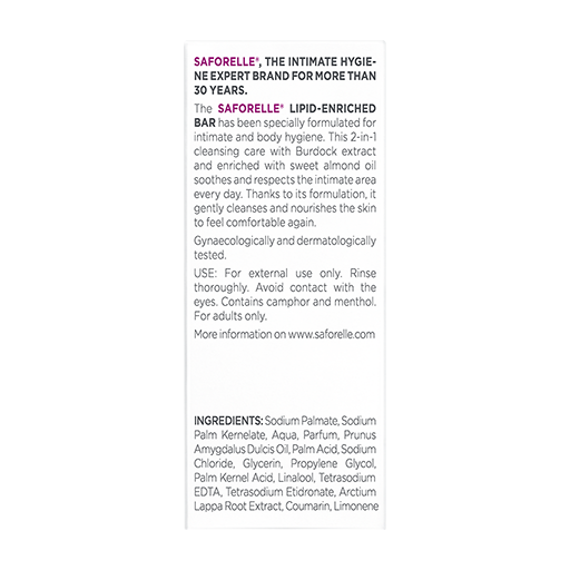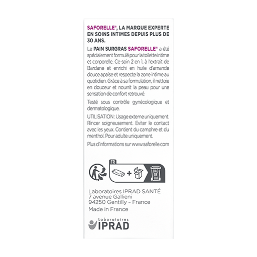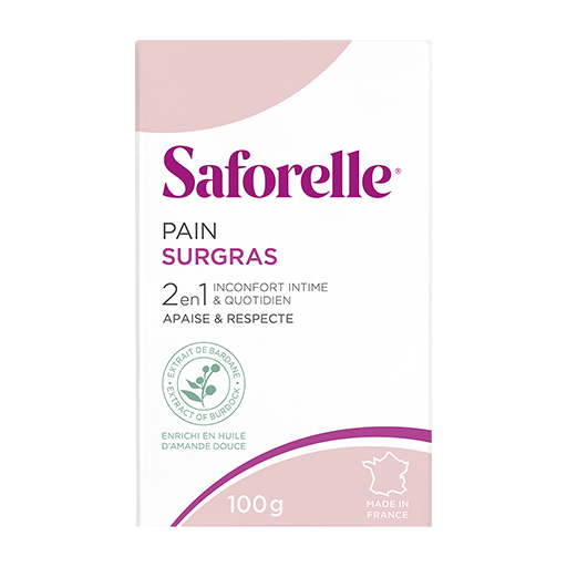 Le savon ou pain Surgras de Saforelle permet de nettoyer en douceur la zone intime sans la dessécher, tout en calmant les irritations. Il est en effet important d’utiliser des produits adaptés non agressifs pour les muqueuses afin de préserver sa flore vaginale. Ce savon s’utilise également pour le corps. Vous n’avez ainsi pas besoin de plusieurs produits pour votre toilette corporelle et intime. Il sera par ailleurs votre compagnon de voyage idéal en n’encombrant pas votre trousse de toilette ou votre vanity. Formulé avec des extraits de bardane, plante d’Asie et d’Europe reconnue depuis l’Antiquité pour ses propriétés apaisantes et calmantes, le savon surgras vous apporte un confort et une sensation de bien-être optimal. Le pain surgras au pH alcalin est également enrichi en huile d’amande douce pour un nettoyage et une application tout en douceur et une réelle sensation d’apaisement. Les racines de Bardane sont aujourd’hui cultivées en France et soigneusement sélectionnées par Saforelle.