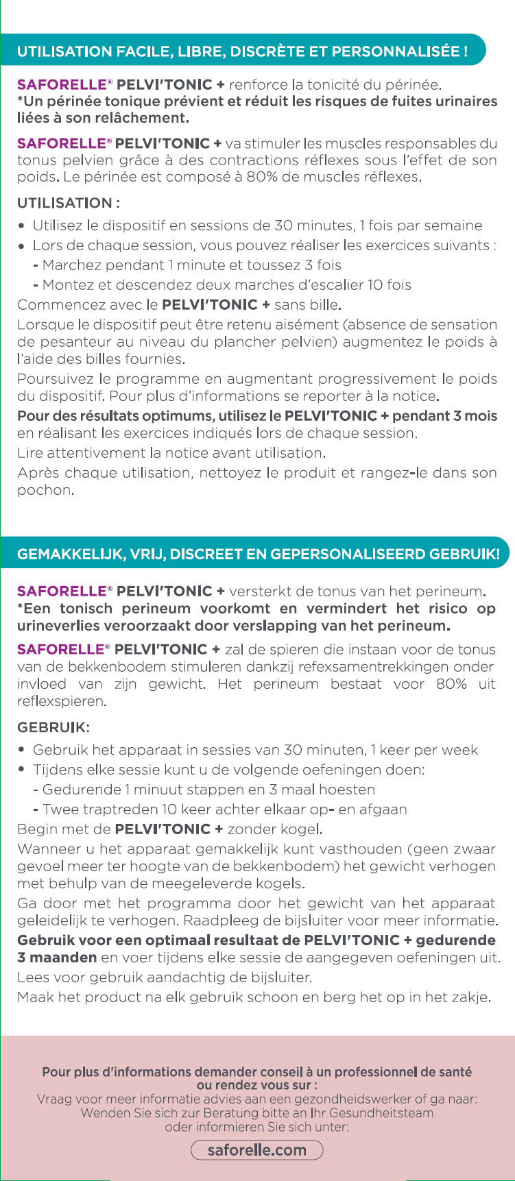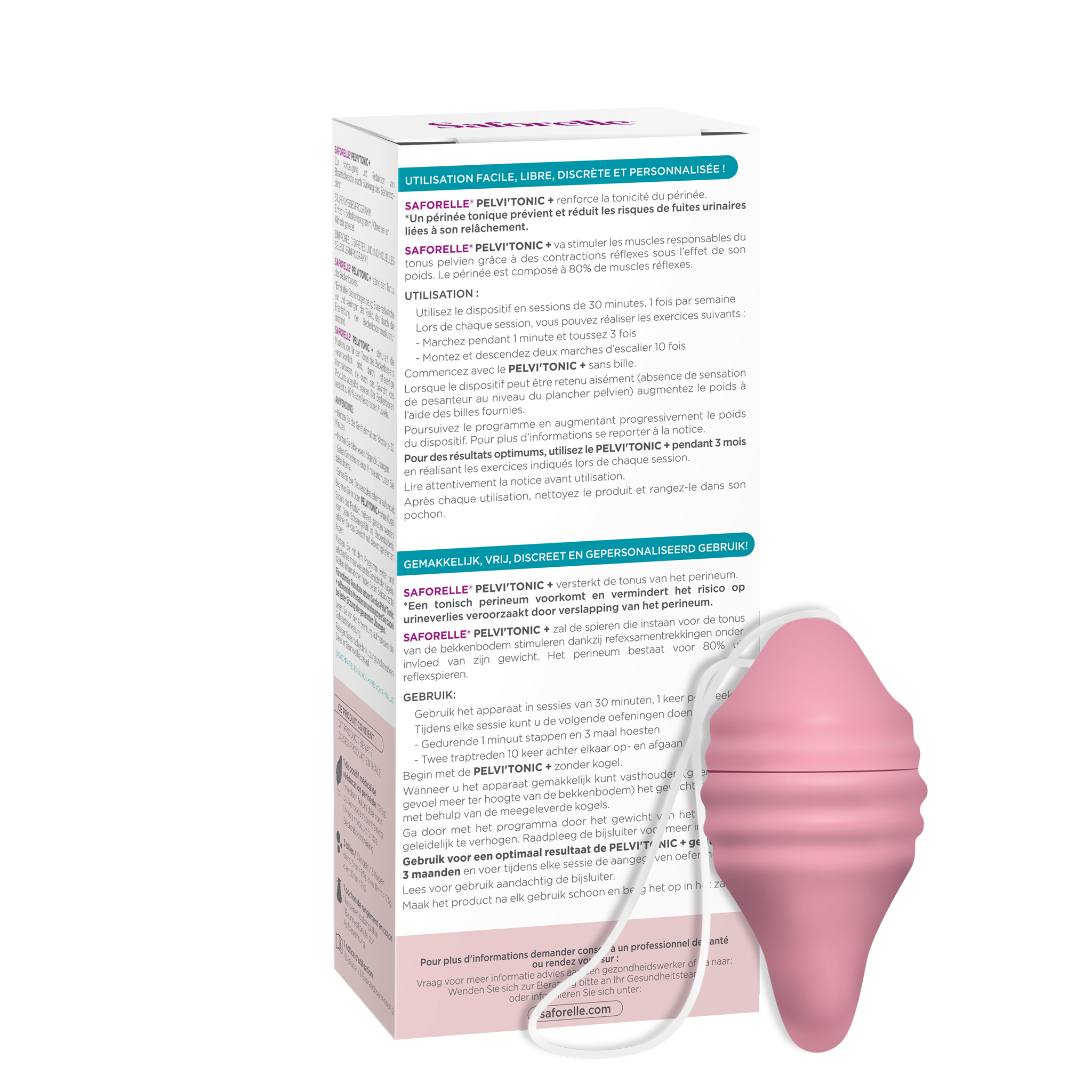 Saforelle Pelvi'Tonic+ est un dispositif médical intravaginal, testé sous contrôle gynécologique. Il prévient et réduit les fuites urinaires grâce au renforcement du périnée. Saforelle Pelvi'Tonic+ va stimuler les muscles responsables du tonus pelvien grâce à des contractions réflexes sous l'effet de son poids. Programme évolutif, 1 fois par semaine par session de 30 minutes pendant 3 mois, facile d'utilisation, sans ondes. Lire attentivement la notice avant chaque utilisation