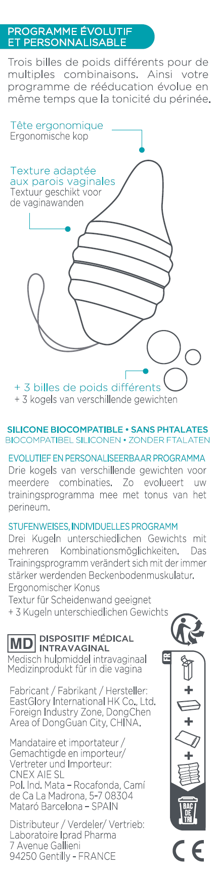 Ingrédients : Silicone biocompatible, sans phtalates contient 1 dispositif médical de rééducation périnéale, 3 billes de poids différents, 1 pochon de rangement en coton, 1 notice d'utilisation