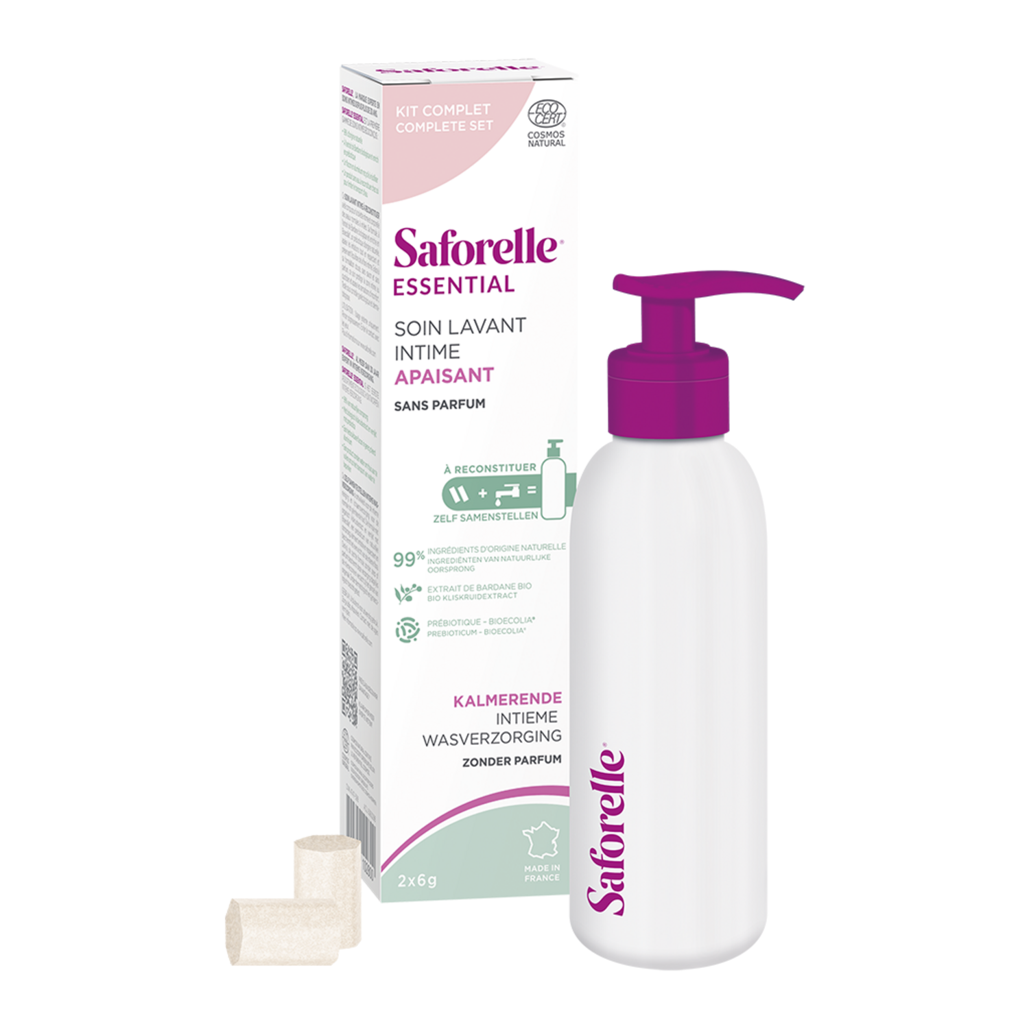 | Libellé | Saforelle Soin Lavant Intime Essential Apaisant Starter Kit 2 Sticks + 1 Flavon Pompe |