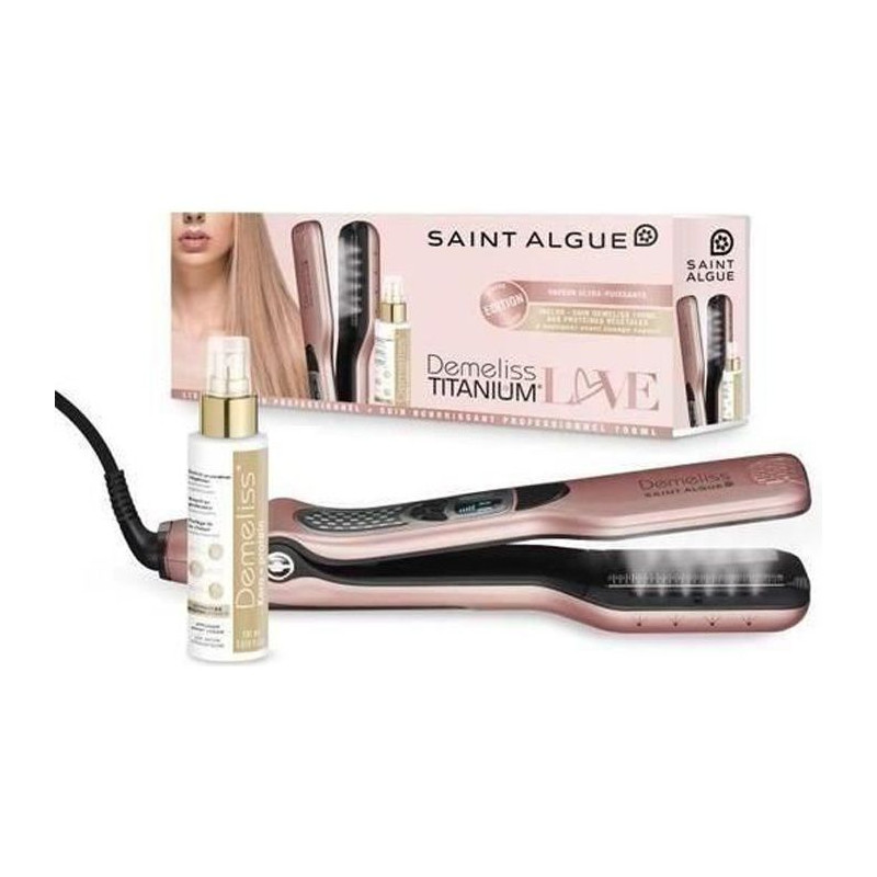 SAINT ALGUE Coffret Lisseur vapeur Demeliss TITANIUM Love Edition + Soin nourrissant 100ml Kera-PROTEIN Lisseur vapeur plaques flottantes revetement titane, peigne latéral rétractable, réservoir 40ml, 150°C-230°C, soin 100ml Demeliss Kera-PROTEIN inclus a base de protéines végétales