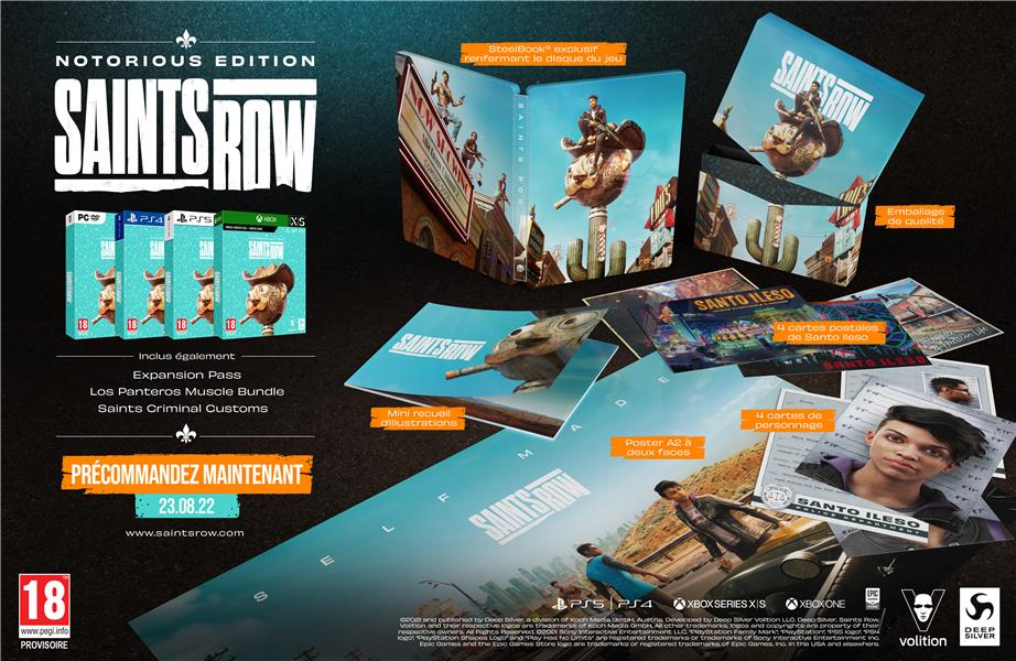 Bienvenue à Santo Ileso, une ville fictive pleine d'animation située au coeur du Sud-ouest américain. Dans ce monde rongé par le crime où les factions se disputent le pouvoir, une bande de jeunes amis partis de rien entame sa propre aventure criminelle pour la gloire et le succès. Vous incarnez le futur boss. Aux côtés de Neenah, de Kevin et d'Eli, vous formez les Saints et vous attaquez aux Panteros, aux Idoles et à Marshall en étendant votre empire dans les rues de Santo Ileso pour en prendre le contrôle. Dans le fond, Saints Row retrace l'histoire d'une start-up, sauf que les Saints opèrent dans le crime. Découvrez le meilleur et le plus étendu des terrains de jeu jamais créés pour Saints Row. Le monde unique et tentaculaire de Santo Ileso sert de toile de fond à cet immense sandbox sauvage. Usez d'armes, de véhicules et de combinaisons ailées pour vous hisser au sommet au fil d'opérations à sensations fortes, d'aventures criminelles et de missions de gros calibre.