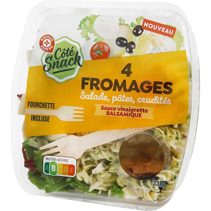 Salade composée de pâtes alimentaires, de crudités (18,1 %), de mozzarella, de scamorza goût fumé, de fourme d’Ambert, de fromage à pâte dure et d'olives noires dénoyautées accompagnée d’une sauce vinaigrette au vinaigre balsamique COTE SNACK