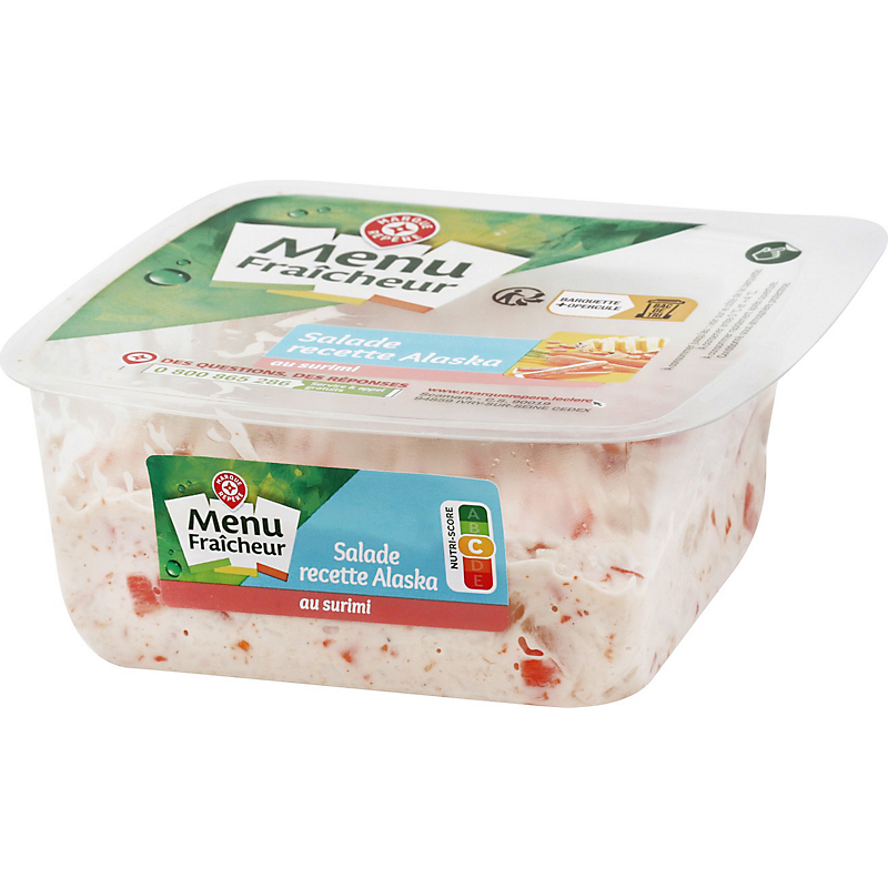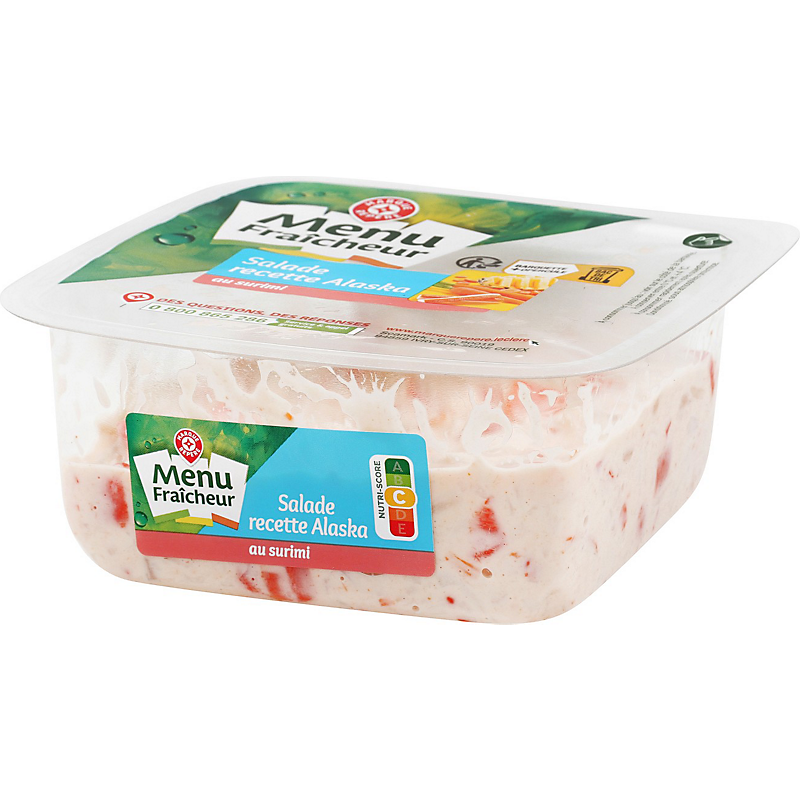 Ingrédients : surimi 44% (eau, chair de poisson, amidon (dont blé), blanc d'œuf, sucre, amidon modifié, huile de colza, sel, huile de soja, colorant : extrait de paprika, stabilisants : sorbitols ; E450 ; E451, arômes (dont crustacés), exhausteur de goût : glutamate monosodique) ; ananas 14% ; huile de colza ; carottes cuites 11% ; eau ; jus de citron à base de concentré ; vinaigre d'alcool ; sel ; moutarde (eau, graines de moutarde, vinaigre d'alcool, sel) ; amidon modifié de pomme de terre ; sucre ; jaune d'œuf en poudre; conservateur : E202 ; épaississant : gomme xanthane ; poivre ; sirop de glucose.
