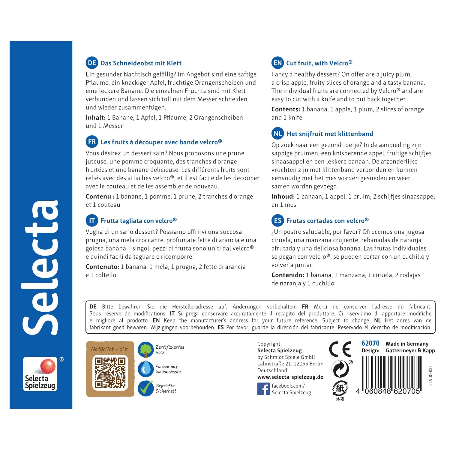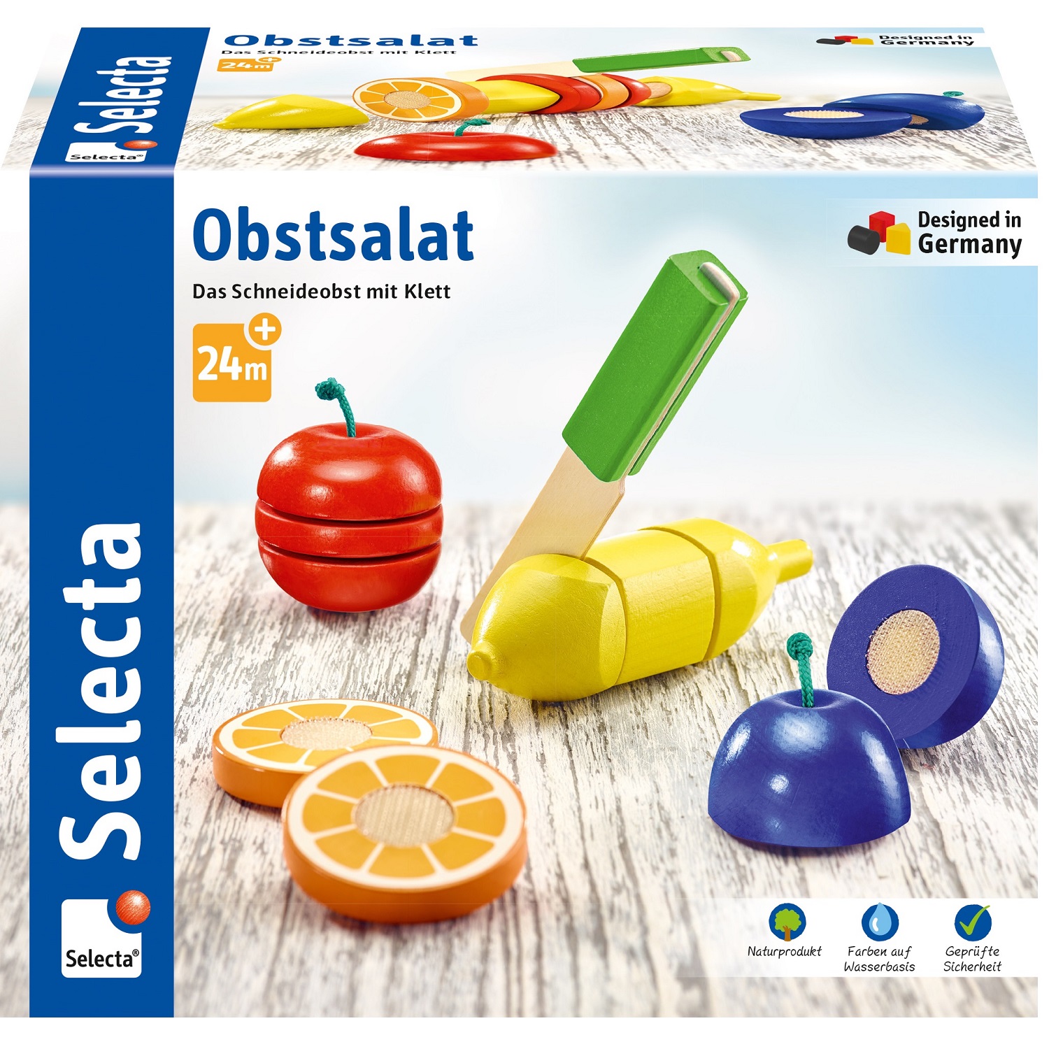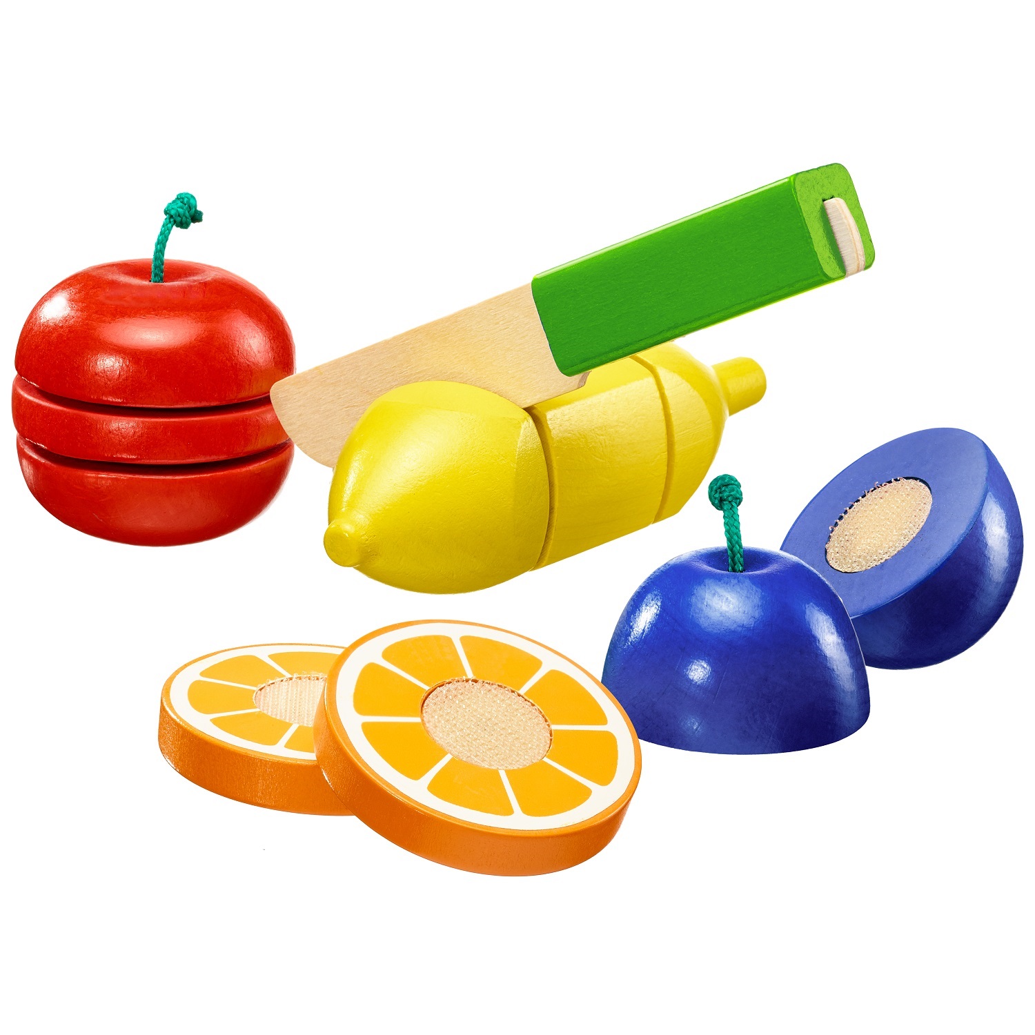 Les différents fruits en bois sont reliés avec des attaches velcro. C'est tellement chouette de les découper avec un couteau puis de les réunir à nouveau !