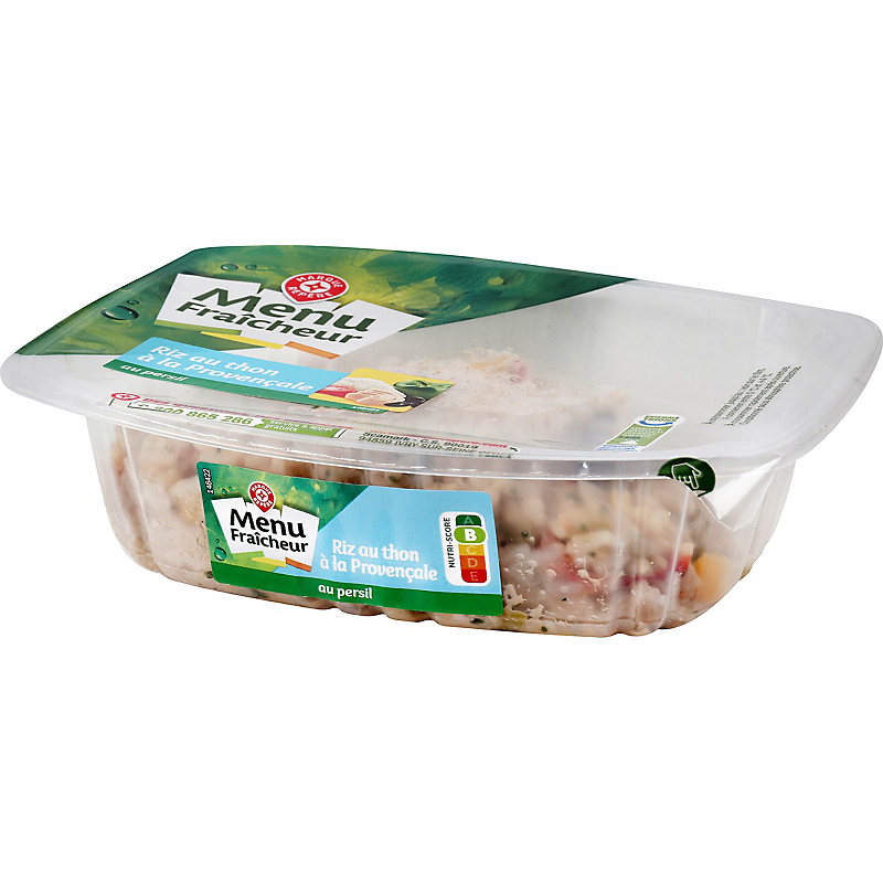 Ingrédients : Riz cuit 54,7 % (eau, riz) ; maïs ; thon Listao à l'huile de tournesol 10,1 % (thon Listao 9,5 %, huile de tournesol, sel) ; poivron vert 7,6 % ; tomate 4,5 % ; poivron rouge 3,8 % ; vinaigre d'alcool ; olive noire en saumure en rondelles 2 % (olive noire, eau, sel, stabilisant : E579) ; huile de colza ; persil 0,7 % ; sel ; moutarde de Dijon (eau, graines de moutarde, vinaigre d'alcool, sel) ; arôme naturel de poivre ; conservateur : E202 ; épaississants : gomme xanthane, gomme guar.