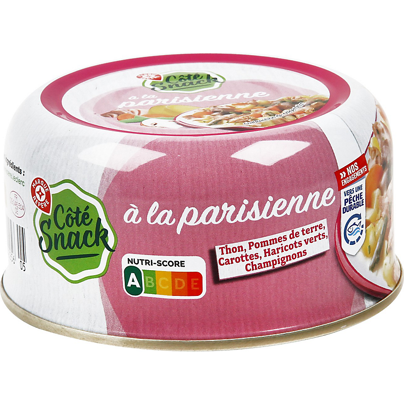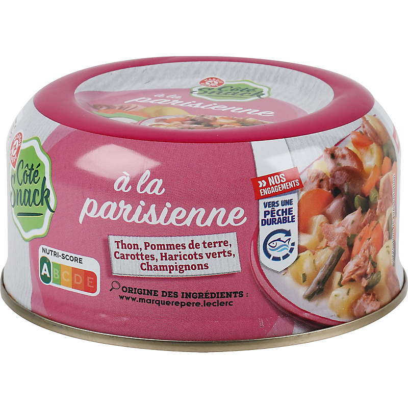 Ingrédients: Thon listao 23 %, eau, pommes de terre 18 %, carottes 10 %, haricots verts 8 %, huile de colza, champignons 6 %, vinaigre d'alcool, amidon de maïs, moutarde (eau, graines de moutarde, vinaigre d'alcool, sel), sel, persil, fibres de lin et fibres d'agrumes.