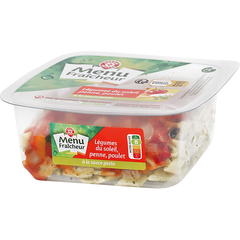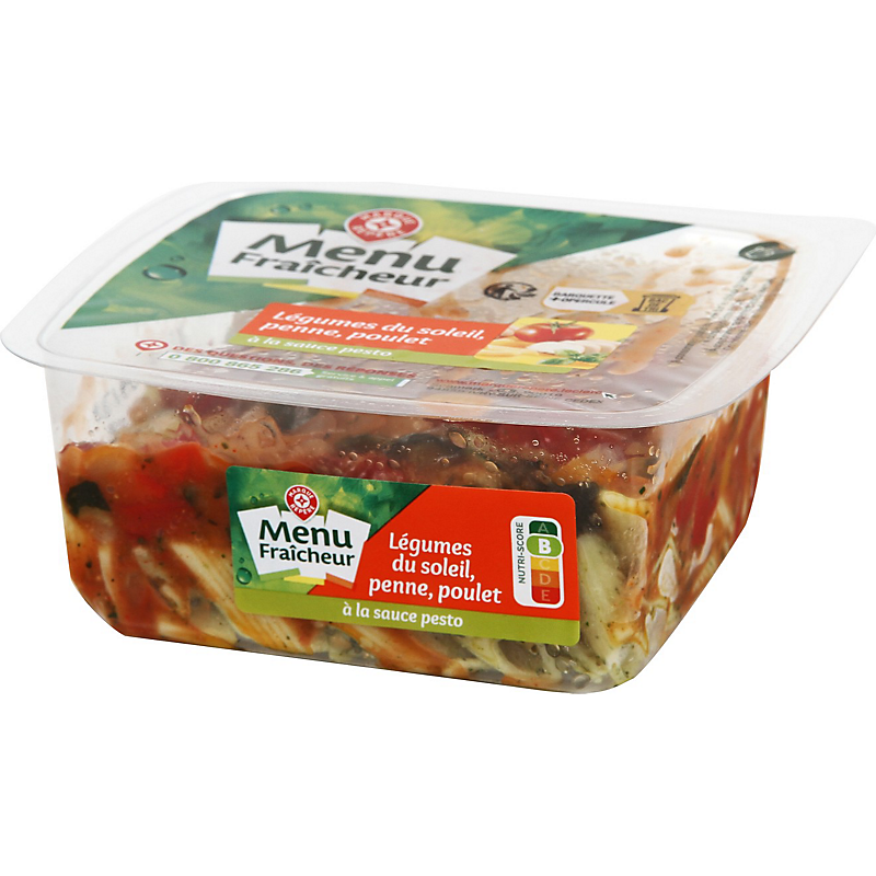Ingrédients : Légumes 43% (courgette grillée, poivron, tomate 10%, oignon) ; pâtes penne cuites 30% (eau, semoule de blé, sel) ; eau ; poulet traité en salaison cuit rôti 4,2% (viande de poulet 4,1%, eau, dextrose, huile de tournesol, amidon de pomme de terre, fibre de blé, sel, épaississant : carraghénanes, stabilisant : triphosphates) ; purée de tomates double concentrée ; huile de colza ; huile d'olive vierge extra 2,1% ; sucre ; basilic 1,3% ; vinaigre d'alcool ; jus de citron à base de concentré ; sel ; amidon modifié de pomme de terre ; Parmigiano Reggiano 0,3% ; conservateur : E202 ; paprika ; acidifiant : acide lactique ; origan ; épaississant : gomme xanthane ; ail ; ail en poudre ; pignons de pin ; poivre ; thym déshydraté ; moutarde (eau, graines de moutarde, vinaigre d'alcool, sel).