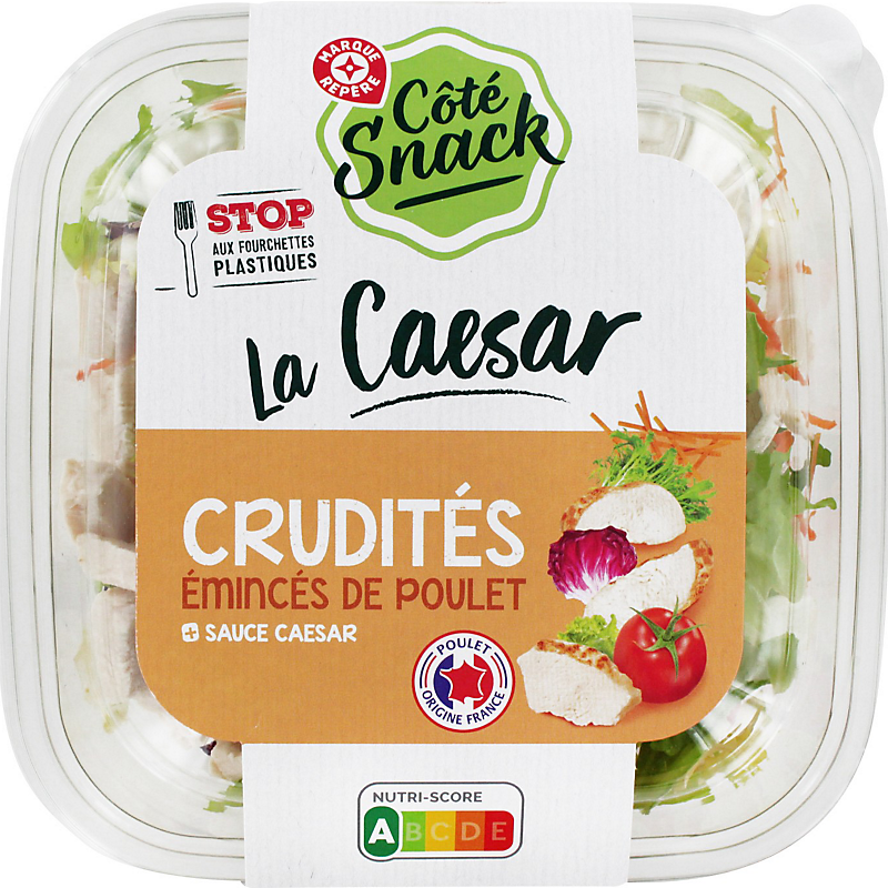 Salade composée de crudités (25 %), de pâtes alimentaires, de viande de poulet rôti traité en salaison et d’œuf dur, accompagnée d’une sauce condimentaire COTE SNACK