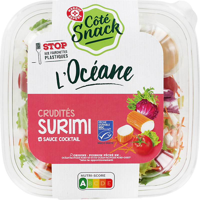 Salade composée de crudités (35,9 %), d’œuf dur, de pâtes alimentaires, de surimi, accompagnée d'une sauce condimentaire COTE SNACK