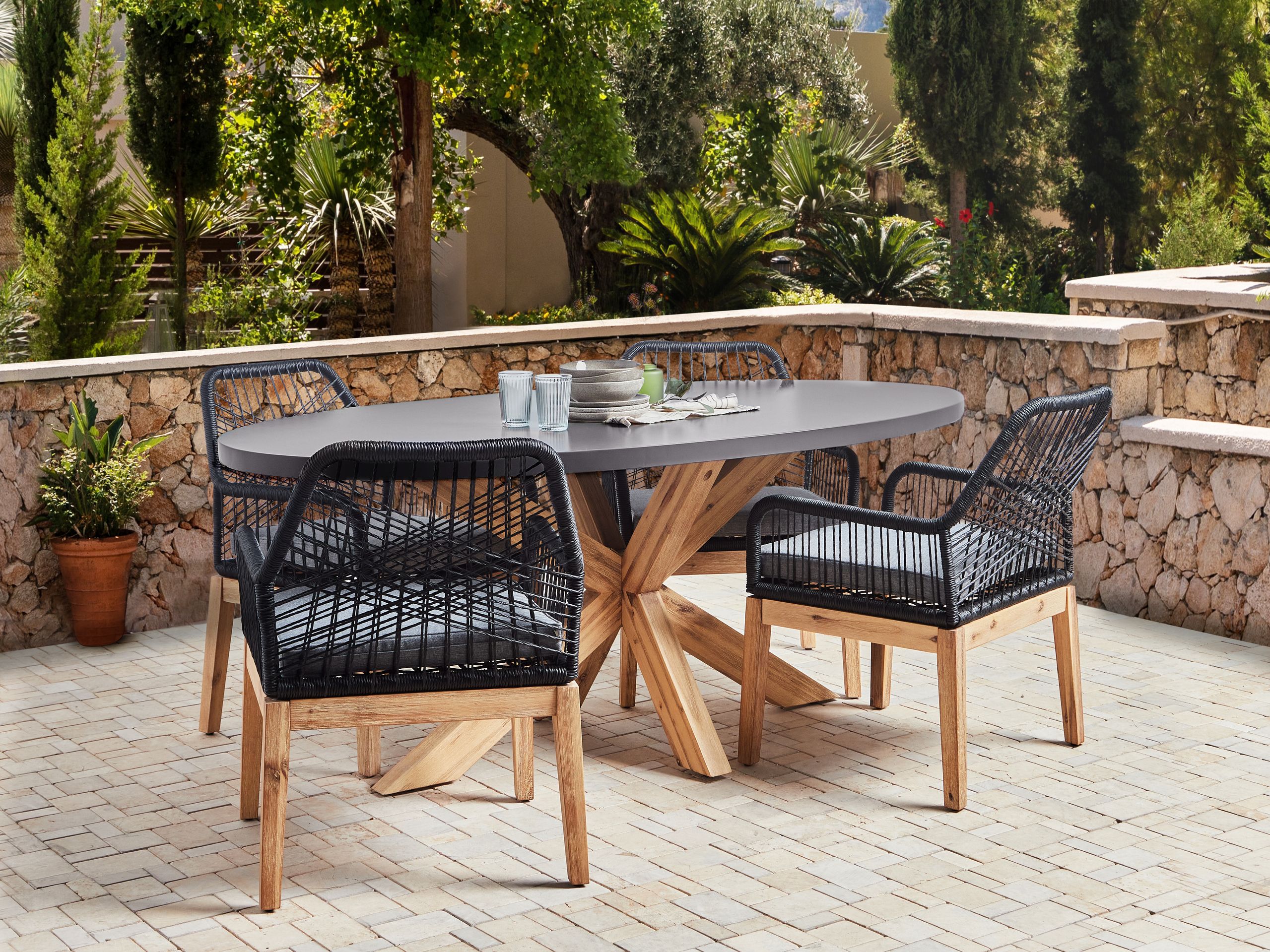 Ensemble de tables de salle à manger en béton avec pieds en acacia. Cet élégant ensemble de jardin, composé d'une table et de quatre chaises dans une couleur noire intemporelle, donnera une nouvelle dimension à votre espace extérieur. Fabriqué à partir de matériaux robustes, l'ensemble allie praticité et élégance. La table et les chaises sont dotées d'un cadre robuste en bois d'acacia, qui leur confère un charme naturel tout en garantissant leur stabilité et leur résistance aux intempéries. Parfait pour les repas de famille décontractés ou les réunions de jardin formelles, cet ensemble polyvalent s'intègre parfaitement à tout espace extérieur.