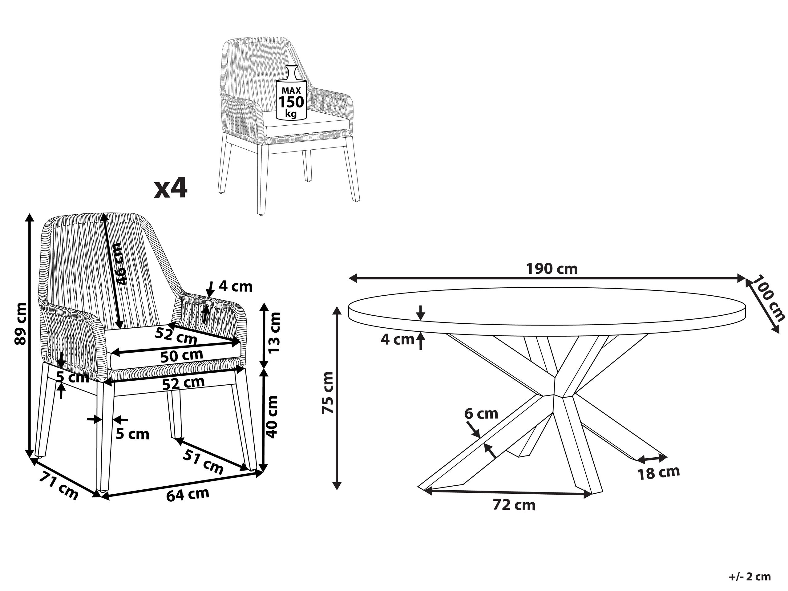 L`offre inclue: 1 x Table, 4 x Chaise, 4 x Coussin d'assise