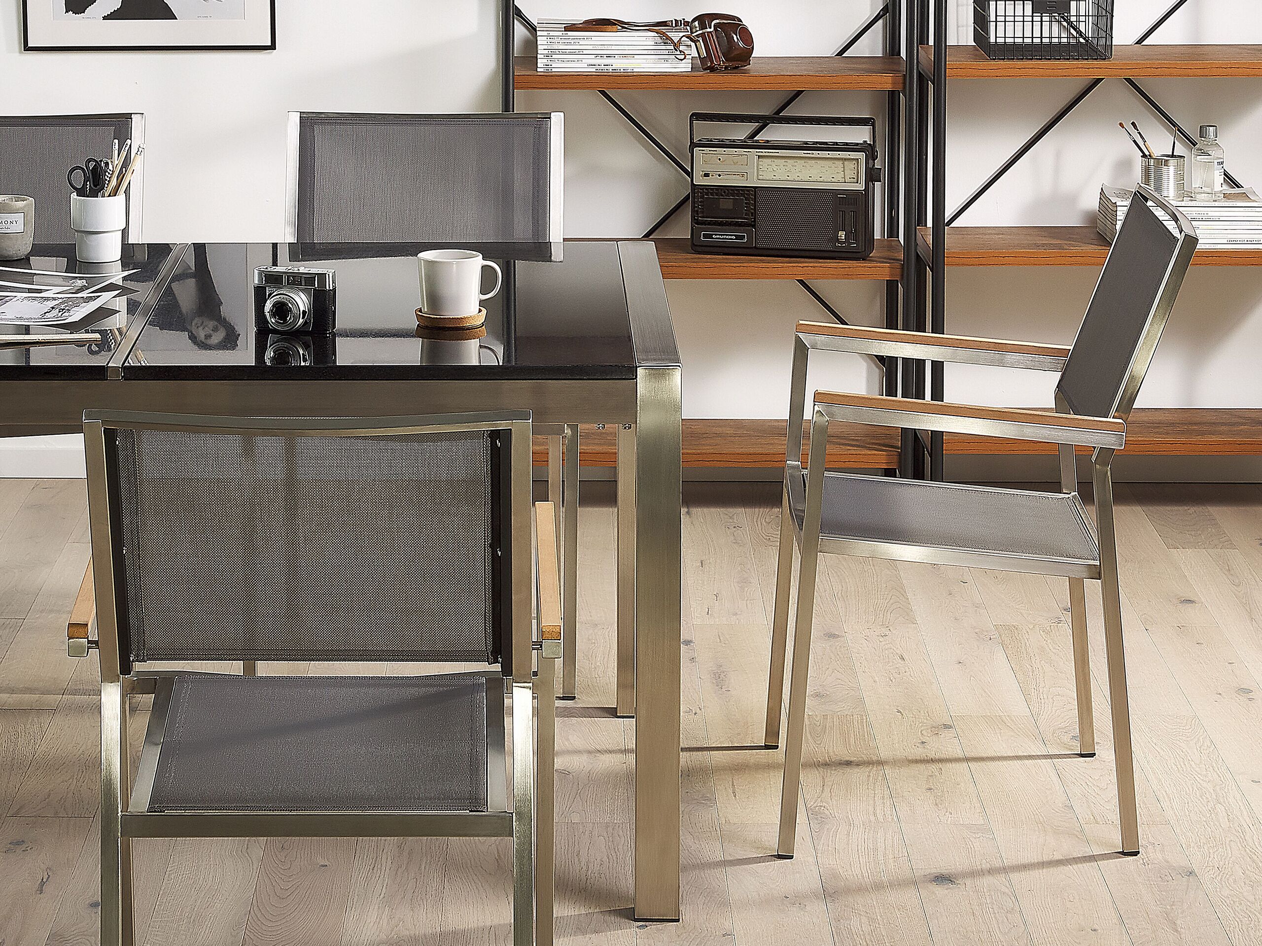 Table acier inox et plateau en basalte avec 6 chaises inclus. Un ensemble de jardin exclusif qui apporte de l'originalité à votre jardin ou à votre terrasse. L'association de l'acier inoxydable et de la pierre polie lui confère un aspect moderne. Le plateau de table en granit résiste aux intempéries et sa couleur gris foncé s'harmonise parfaitement avec le contour argenté. Le cadre en acier est robuste, ce qui garantit que le meuble restera magnifique au fil du temps. Les chaises empilables, fabriquées à partir d'un cadre solide et d'un textile noire résistant aux UV, complètent parfaitement la table.