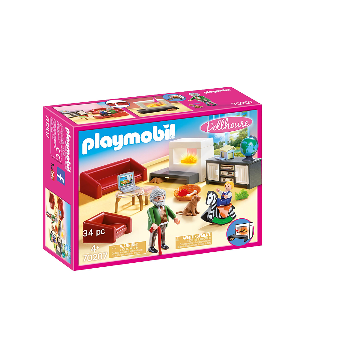 Le confortable salon est le cœur de la maison : toute la famille peut s’y détendre, lire, jouer et s’amuser. Pendant que son petit-fils s’amuse sur son cheval à bascule, papy profite de quelques minutes de calme sur son confortable fauteuil face à la cheminée. Lorsque la famille reçoit des invités, le fauteuil et le canapé peuvent être dépliés pour se transformer en lits. Avec deux personnages, une cheminée (nécessite 2 piles AAA 1,5 V non fournies), un canapé-lit, un fauteuil et un buffet.