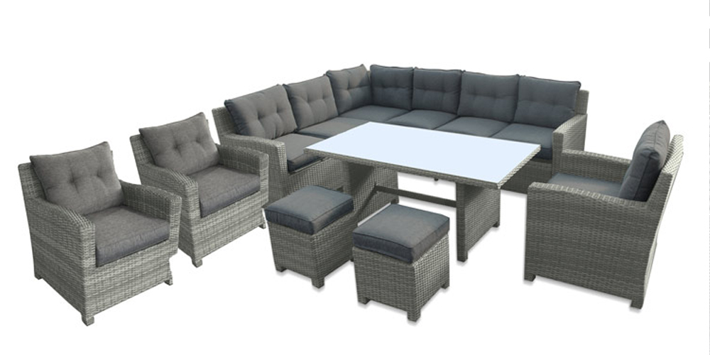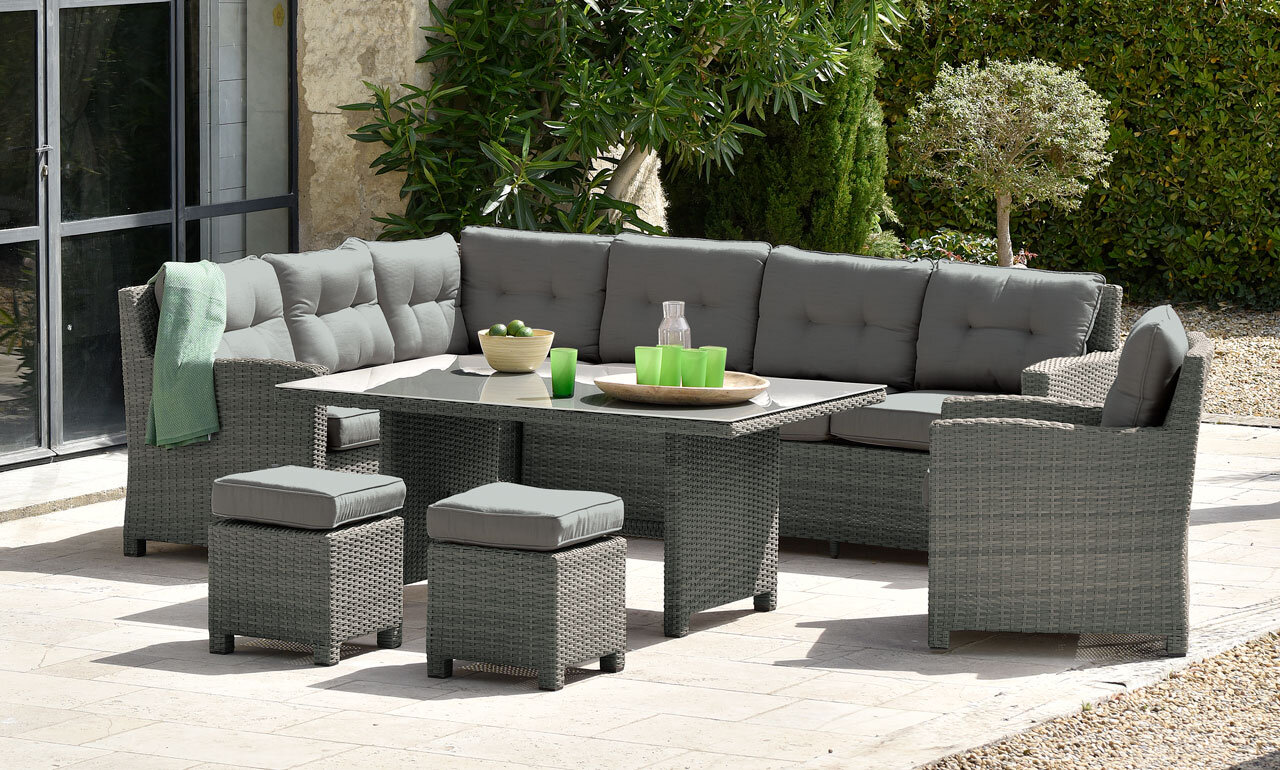 Le salon bas de jardin OLYMPIE, grâce à sa table mi-haute permet une double fonctionnalité ! Il vous permettra de vous détendre et également de partager un repas en famille ou entre amis. C'est un salon dinatoire ! Le salon OLYMPIE est composé d'un canapé cinq à six places,d'un fauteuil, d'une table et de deux poufs. La structure de cet ensemble est en aluminium traité époxy gris anthracite, recouvert de résine tressée gris anthracite. Ses coussins d'assise et de dossier floconnés en polyester 240gr/m² coloris gris chiné, épaisseur 10 cm, sont déhoussables avec une fermeture éclair. Le plateau de la table est en verre teinté gris épaisseur 5 mm (5 fois plus résistant qu'un verre traditionnel). Aluminium traité epoxy Coloris gris anthracite Coussins d'assise et de dossier floconnés en polyester 240gr/m² épaisseur 10 cm déhoussables Dimensions de la table: L.150 x l.100 x H.67 cm Dimensions du canapé :L.203/255 x P.71 x H.84 cm Dimensions du fauteuil:L.85 x P.71 x H.84 cm Dimension d'un pouf: L.41 x P.41 x H.36 cm La hauteur d'assise est de 36 cm hors coussin. Jusqu'à 9 convives ! 1 colis n° 1 Dimensions (LxlxH) : 208cm x 93cm x 86cm - Poids : 58,5kg 1 colis n° 2 Dimensions (LxlxH) : 153cm x 13cm x 103cm - Poids : 32,1kg 1 colis n° 3 Dimensions (LxlxH) : 81cm x 79cm x 86cm - Poids : 14,8kg