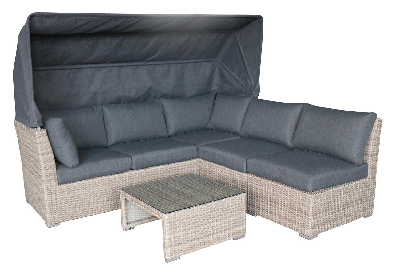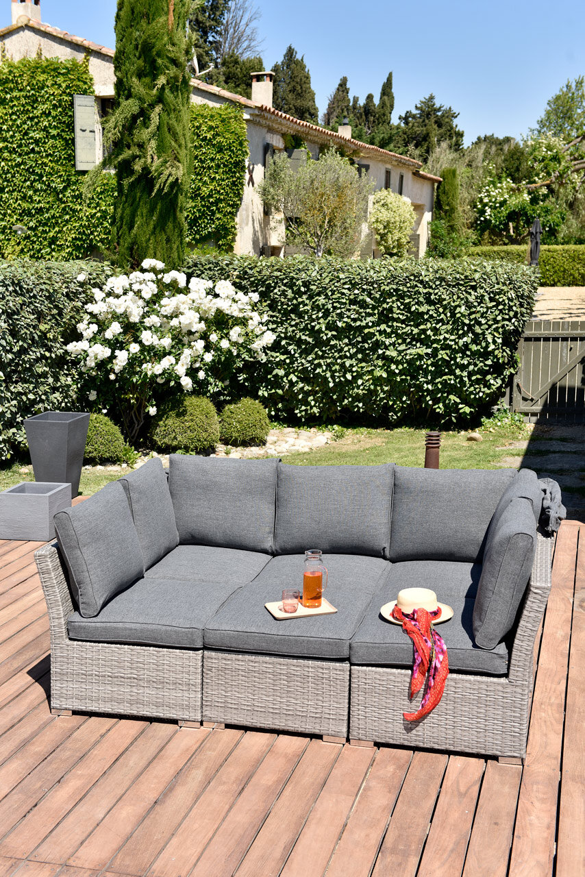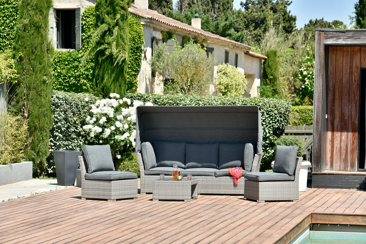 | Libellé | Salon bas de jardin modulable en résine tressée grise avec auvent réglable - 5 places - CHYPRE |