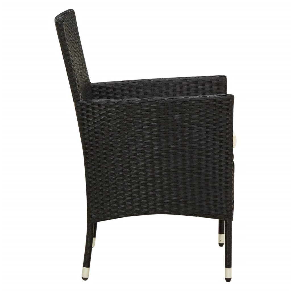 Avec un design élégant et un cadre en acier durable, cet ensemble de meubles de salle à manger est un choix parfait pour votre espace de vie extérieur. Cet ensemble de salle à manger de jardin dispose d’un cadre en acier enduit de poudre, ce qui rend la table et les chaises stables et durables. Grâce à la résine tressée résistante aux intempéries et à l'eau, le mobilier d'extérieur est facile à nettoyer. Les coussins de siège épais et amovibles s'ajoutent au confort d'assise et sont faciles à laver. Remarque : afin de prolonger la durée de vie de vos meubles d'extérieur, nous vous recommandons de les nettoyer régulièrement et de ne pas les laisser à l'extérieur sans protection inutilement.Nettoyage : Utiliser une solution savonneuse douce.Stockage : si possible, stockez dans un endroit frais et sec à l'intérieur. Si le produit est stocké à l'extérieur, protégez-le avec une housse imperméable. Essuyez et séchez l'excès d'eau ou de neige des surfaces planes après la pluie ou une chute de neige. Permettez une circulation d'air suffisante afin d'éviter les dommages liés à l'humidité. Table : Couleur : noir Matériau : résine tressée, acier enduit de poudre, verre trempé Dimensions : 90 x 90 x 75 cm (L x l x H) Chaise : Couleur de la résine tressée : noir Couleur du coussin : blanc cassé Matériau : résine tressée, acier enduit de poudre, tissu (100 % polyester) Dimensions : 61 x 60 x 88 cm (I x P x H) L'assemblage est requis La livraison contient : 1 x table 2 x chaise 2 x coussin