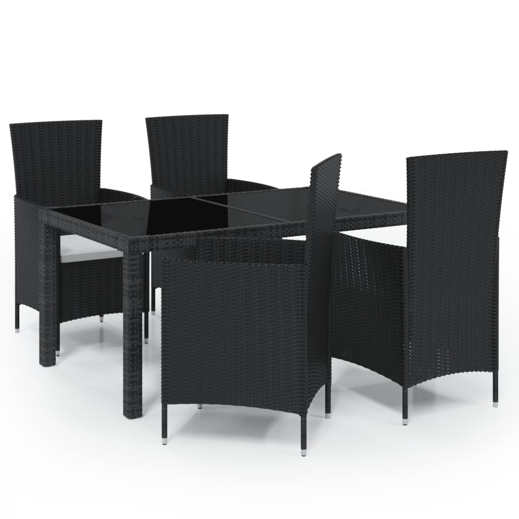 Avec un design élégant et un cadre en acier durable, cet ensemble de meubles de salle à manger est un choix parfait pour votre espace de vie extérieur. Cet ensemble de salle à manger de jardin dispose d’un cadre en acier enduit de poudre, ce qui rend la table et les chaises stables et durables. Grâce à la résine tressée résistante aux intempéries et à l'eau, le mobilier d'extérieur est facile à nettoyer. Les coussins de siège épais et amovibles s'ajoutent au confort d'assise et sont faciles à laver. Remarque : afin de prolonger la durée de vie de vos meubles d'extérieur, nous vous recommandons de les nettoyer régulièrement et de ne pas les laisser à l'extérieur sans protection inutilement.Nettoyage : Utiliser une solution savonneuse douce.Stockage : si possible, stockez dans un endroit frais et sec à l'intérieur. Si le produit est stocké à l'extérieur, protégez-le avec une housse imperméable. Essuyez et séchez l'excès d'eau ou de neige des surfaces planes après la pluie ou une chute de neige. Permettez une circulation d'air suffisante afin d'éviter les dommages liés à l'humidité. Table : Couleur : noir Matériau : résine tressée, acier enduit de poudre, verre trempé Dimensions : 150 x 90 x 75 cm (L x l x H) Chaise : Couleur de la résine tressée : noir Couleur du coussin : blanc cassé Matériau : résine tressée, acier enduit de poudre, tissu (100 % polyester) Dimensions : 61 x 60 x 88 cm (I x P x H) L'assemblage est requis La livraison contient : 1 x table 4 x chaise 4 x coussin