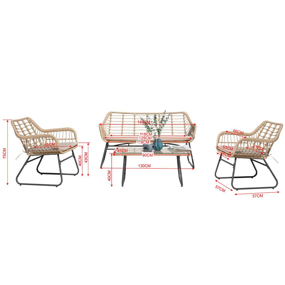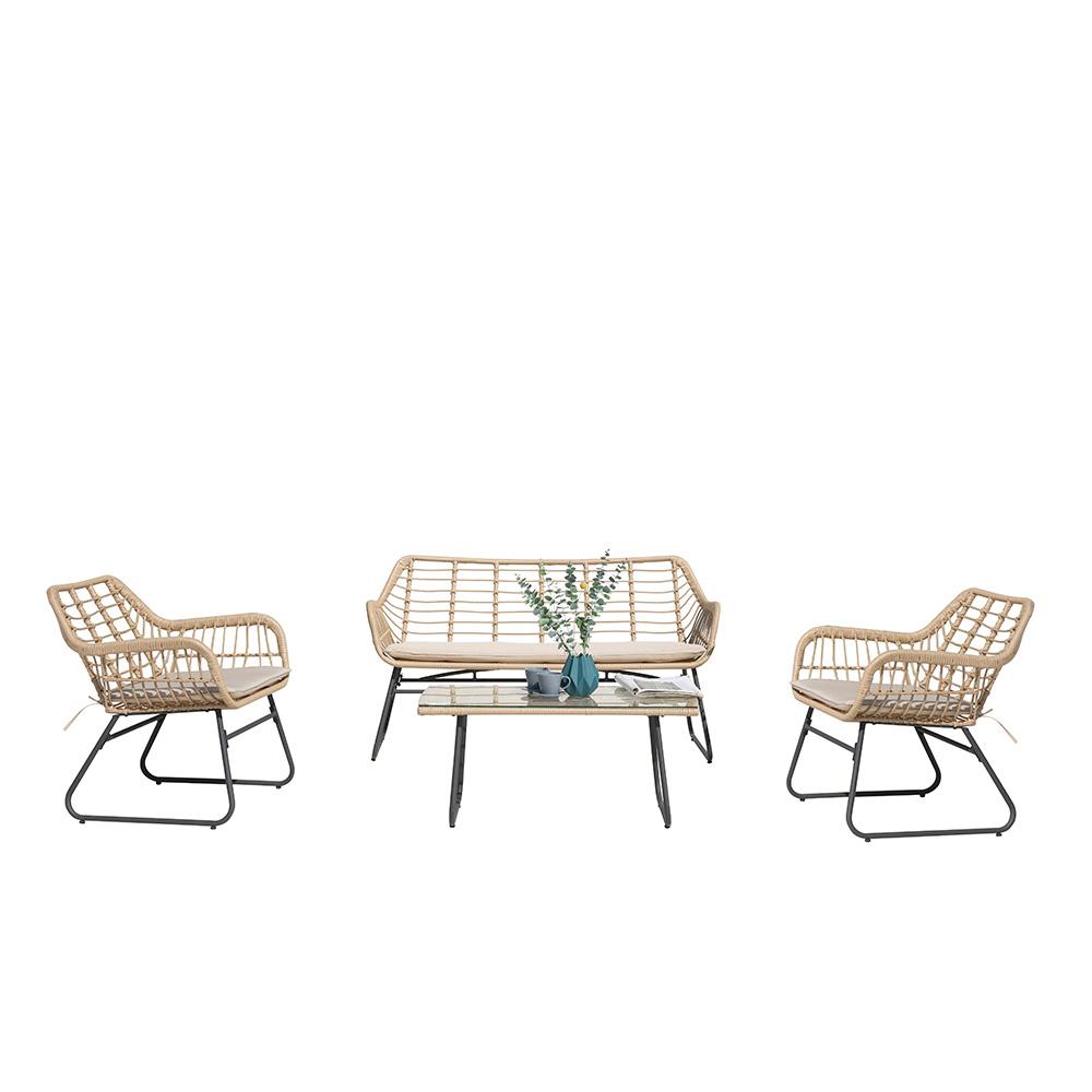 - CARACTERISTIQUES : Nombre de places : 4 / Type : salon bas détente / Couleur structure acier : Noir / Couleur résine : beige clair / Couleur coussins : gris clair / Matière de la structure : acier avec revêtement en poudre / Traitement anti-UV / Matière résine : polyéthylène / Composition coussins : 100% polyester / Composition housses : 100% fibre polyester 180g/m2 / Housse de coussin amovible / Housse lavable / Épaisseur coussin d'assise : 3 cm / A monter soi-même (montage facile) / Notice incluse / Nombre de colis : 1.
