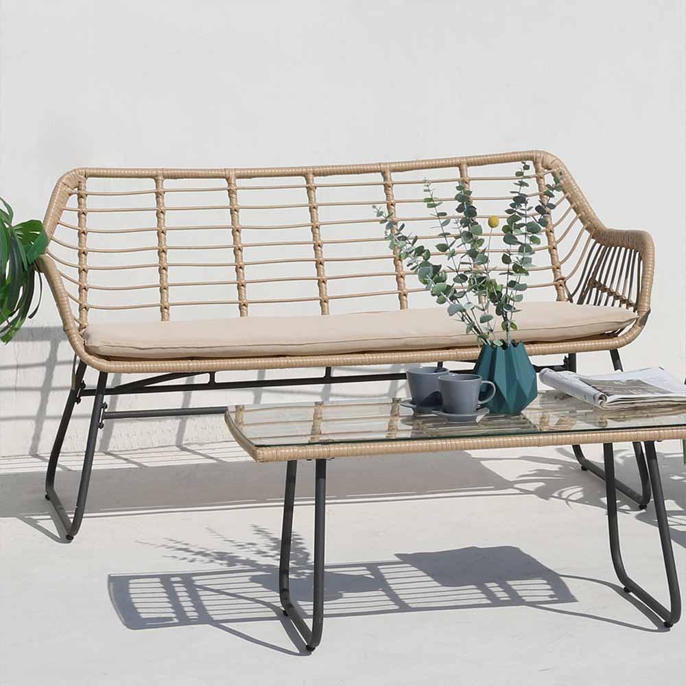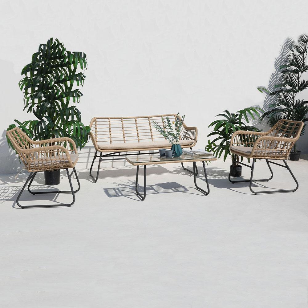 - SALON DE JARDIN 4 PLACES POLYROTIN / ACIER : le salon de jardin 4 places BORABORA se compose d'un canapé 2 places, de deux fauteuils et d'une table basse avec plateau en verre trempé 5mm. Ce salon de jardin au design tendance s'intégrera parfaitement dans sur une terrasse, dans un jardin et mêmes dans les petits espaces. Le mélange des matières, résine tressée + acier, lui confère un style naturel et bohème qui donneront du caractère à votre extérieur.