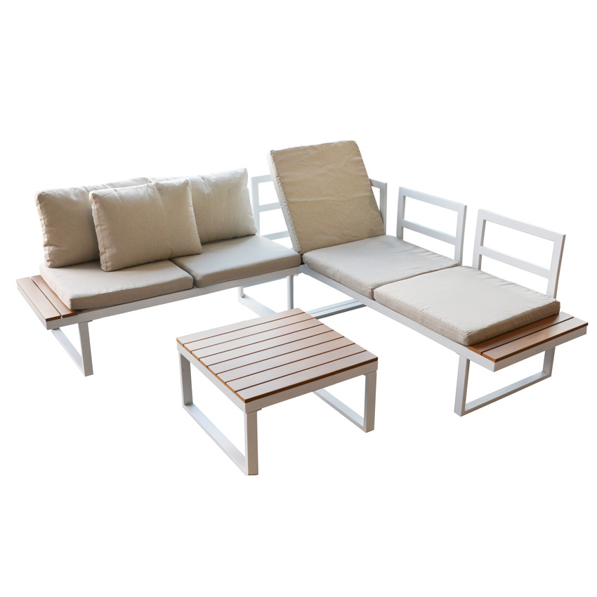Découvrez le Salon Bas d'Angle de Jardin MORELIA, la solution idéale pour embellir votre espace extérieur tout en profitant de moments de détente inoubliables. Structure : Matériau : Acier blanc robuste et résistant aux intempéries. Design moderne et épuré pour s'intégrer parfaitement dans tout type de jardin ou terrasse. Composition : Table basse : Carrée, avec un plateau couleur teck. Deux canapés : Confortables, avec une assise large et un dossier ergonomique. Un siège : Transformable en méridienne grâce à une assise amovible réglable en 4 positions. Confort : Livré avec des coussins en polyester filé 210gr/m², coloris beige, déhoussables pour un entretien facile. Épaisseur des coussins : 8 cm pour un confort optimal. Dimensions Canapés (x2) : L.127.5 x P.60 x H.64.5 cm Tablettes (x2) : L.57 x P.14 cm Fauteuil : L.64 x P.77.5 x H.79 cm Table basse : L.55.5 x l.55.5 x H.32 cm Informations Techniques Garantie : 2 ans Dimensions et poids des colis : Colis n°1 : 131 cm x 61 cm x 19 cm - Poids : 30,0 kg Colis n°2 : 131 cm x 61 cm x 19 cm - Poids : 30,0 kg Points Forts Modularité : La méridienne réglable en 4 positions pour un confort personnalisé. Design élégant : S'accorde parfaitement avec d'autres articles de la catégorie Salon bas en bois. Facilité d'entretien : Coussins déhoussables et lavables.