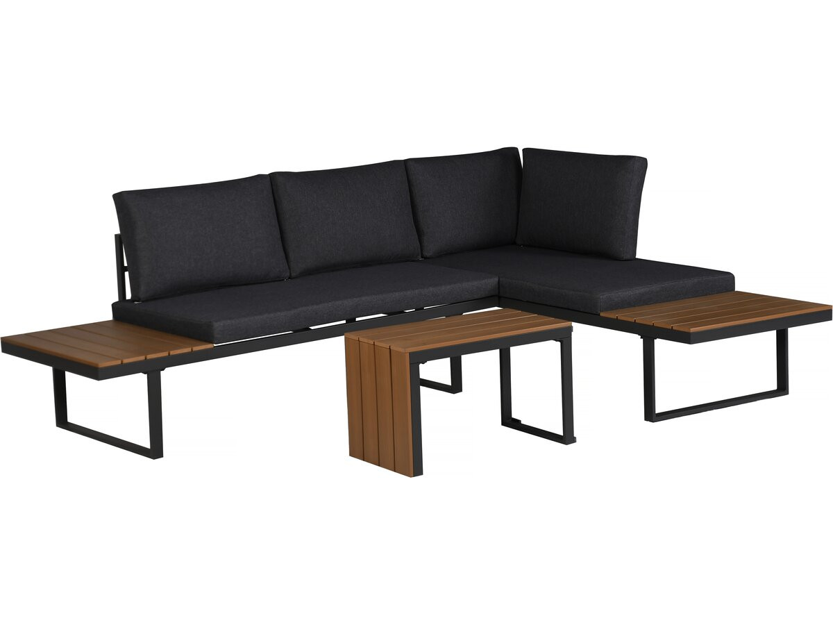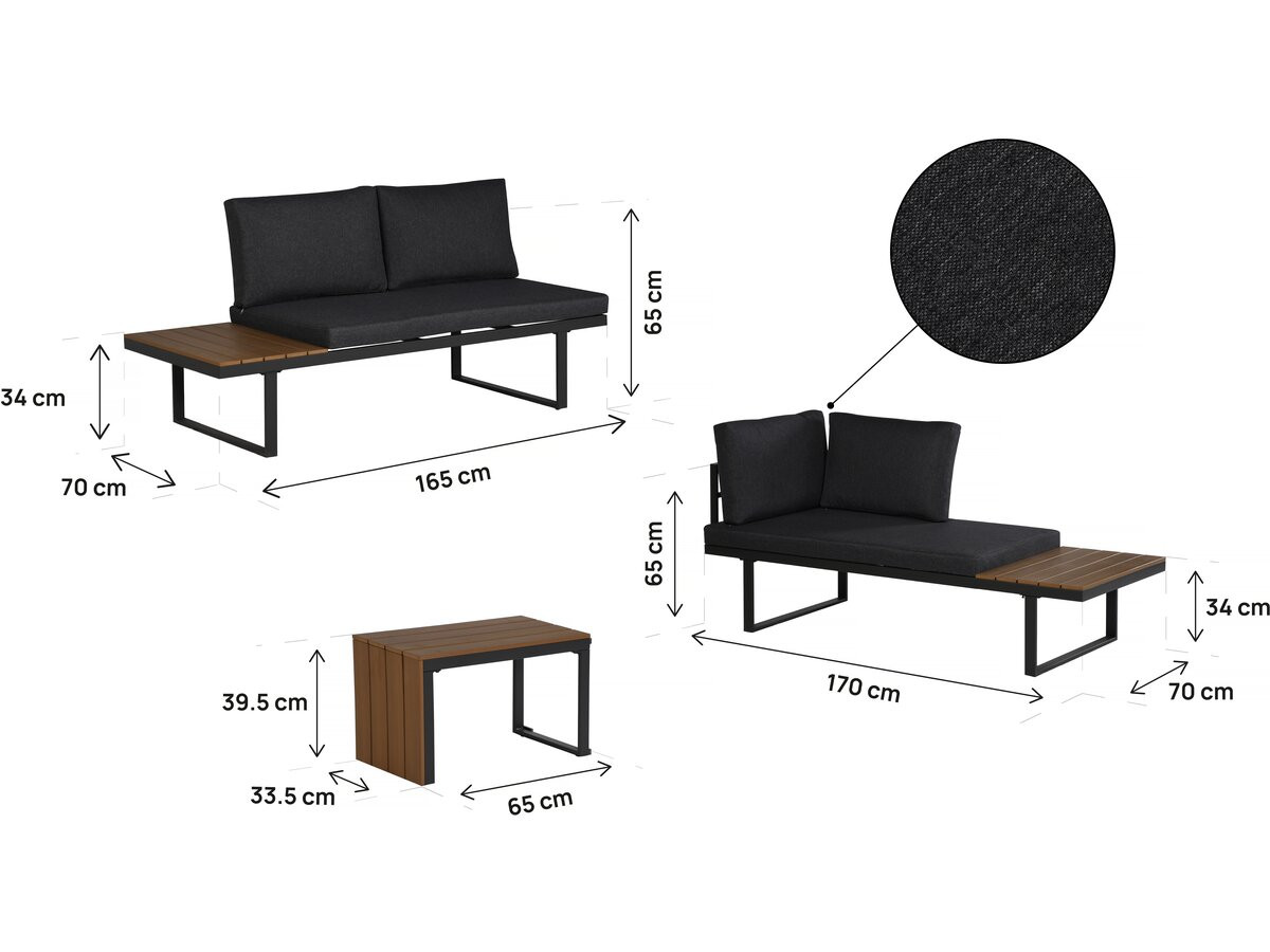 Salon de jardin modulable imitation bois "Sylva" - 4 places - GrisLe salon de jardin "Sylva" 4 places est parfait pour aménager un espace extérieur moderne et convivial sur votre terrasse, balcon ou jardin. Il se compose de deux canapés de 165 x 70 x 65 cm et d'un canapé d'angle de 170 x 70 x 65 cm, offrant une configuration spacieuse et modulable selon vos envies. Sa table basse de 65 x 34 x 40 cm permet de profiter pleinement de vos moments de détente en plein air. Le plateau de table aspect bois apporte une touche chaleureuse et élégante à l'ensemble. Sa structure en métal assure solidité, stabilité et durabilité face aux conditions extérieures. Les coussins en tissu de 8 cm d'épaisseur garantissent un confort optimal pour vos instants de convivialité. Grâce à son design, le salon "Sylva" peut être réorganisé facilement pour s'adapter à tous les espaces. Sa couleur grise intemporelle s'intègre harmonieusement à tous les styles de décoration extérieure. Alliant esthétisme, confort et robustesse, ce salon de jardin est conçu pour un usage quotidien. Le salon de jardin "Sylva" est le choix idéal pour profiter d'un espace extérieur accueillant et élégant. Salon de jardin "Sylva" - 4 places - Dimensions canapé x2 : 165 x 70 x 65 cm - Dimensions canape d'angle : 170 x 70 x 65 cm - Dimensions table : 65 x 34 x 40 cm - Plateau de table aspect bois - Structure en métal - Coussin en tissu de 8 cm - Gris .Couleurs: Gris